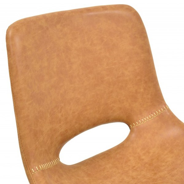 Diseño innovador y altamente confortable es la silla de comedor KATIC, con el respaldo y asiento de forma cóncava, con lo que conseguimos que nuestra espalda esté bien sujeta y podamos disfrutar durante varias horas de comidas o reuniones de empresa. Es mullida y toda ella tapizada en similpiel de color marrón claro, lleva como adorno en la zona del asiento y respaldo un agujero en forma ovalada y costuras con pespunte con hilo más claro. En conjunto forman un harmonioso dibujo que realza la calidad de sus acabados. La base inferior consta de cuatro patas de metal reforzado de forma rectangular con acabados de pintura epoxi en color negro, es maravillosa la combinación del color de la tapicería con el color negro de las patas.