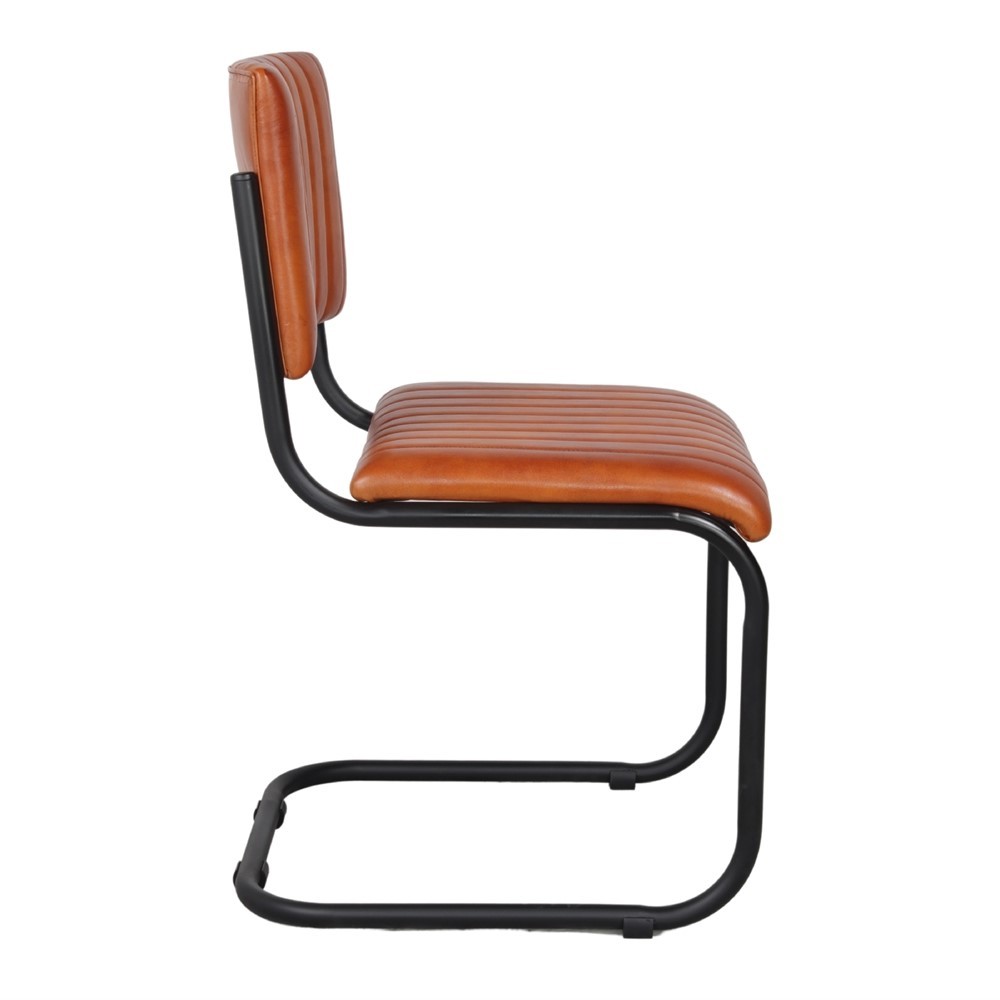 Y bello es el diseño de la silla CORVA, un modelo de estilo clásico-vintage con asiento y respaldo presentado en dos piezas separadas y tapizados en piel de cabra en color marrón, con pespuntes decorativos que le otorgan un mejor acabado final. Todo ello se sostiene gracias a una estructura tubular realizada en metal de color negro.