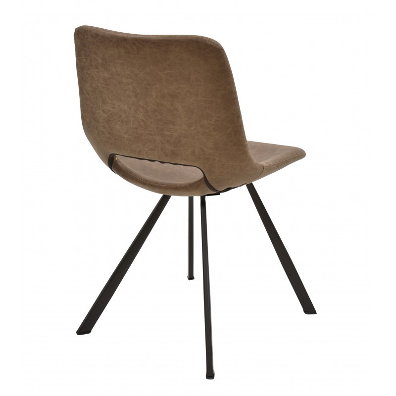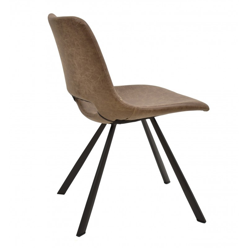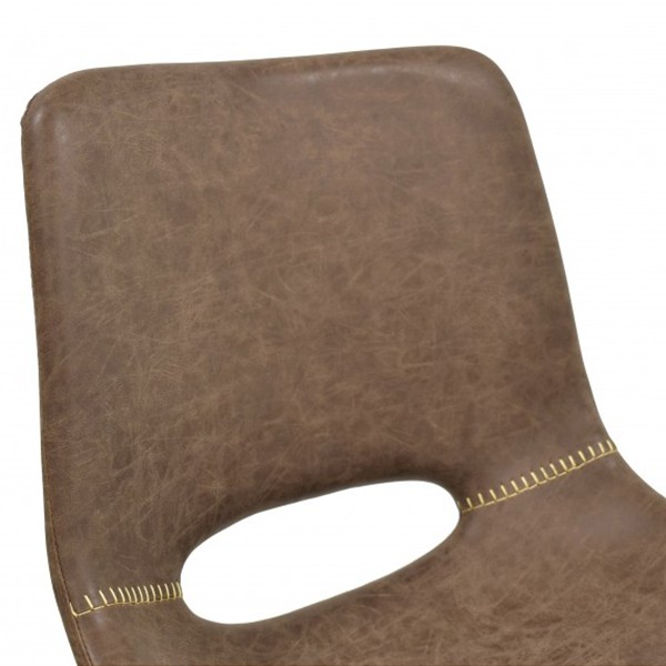 Respaldo y asiento fabricado en polipropileno inyectado, mullida y totalmente tapizada en similpiel color marrón oscuro. Material de mucha resistencia a lo largo de los años, es un producto sintético que imita a la perfección a la piel, pero preservando la naturaleza. Entre el respaldo y el asiento posee un agujero de forma oval, siendo todo un detalle que la embellece. En esta zona la tapicería lleva una costura rematada con hilo claro lo que le da un contraste fantástico.