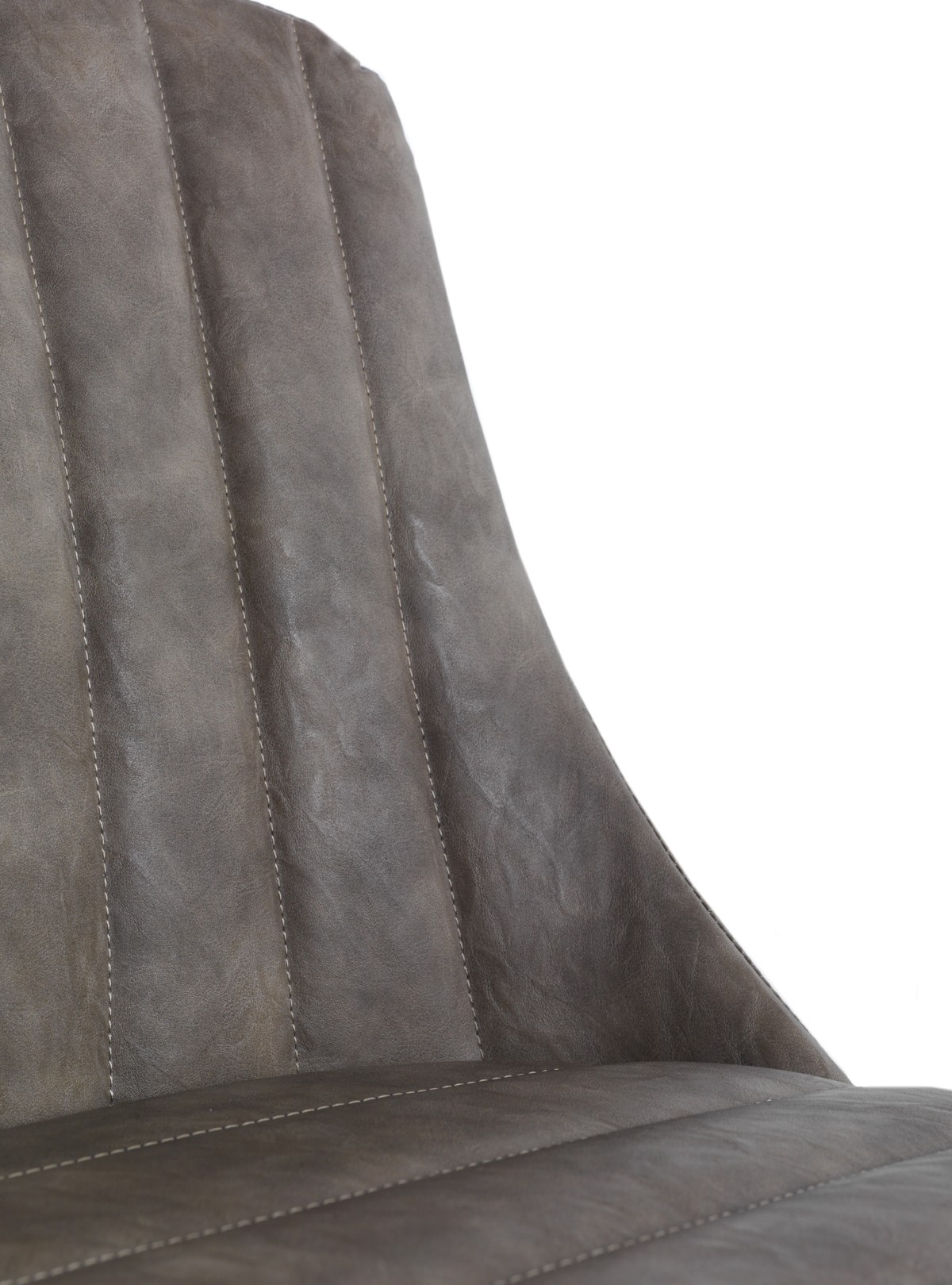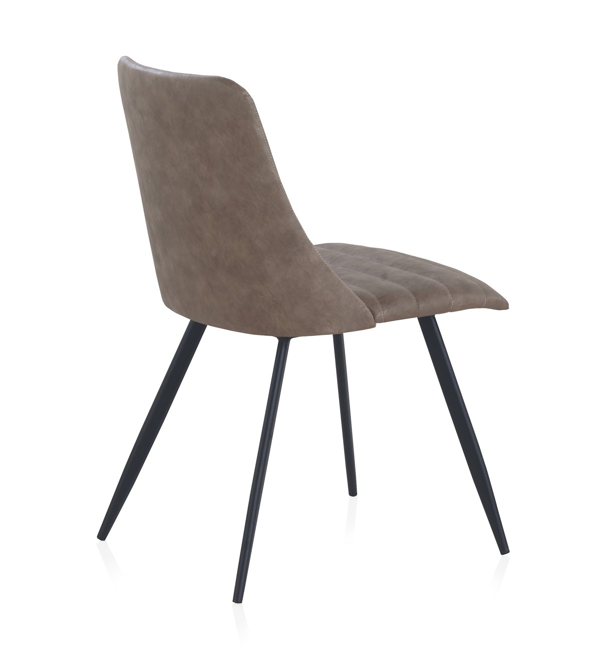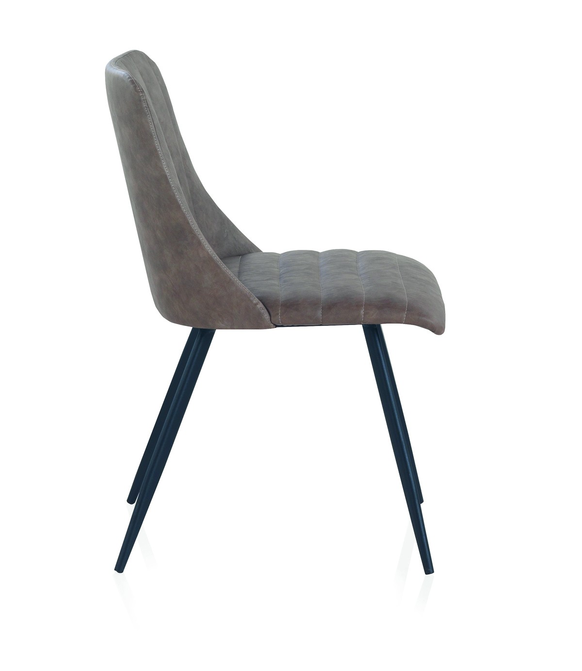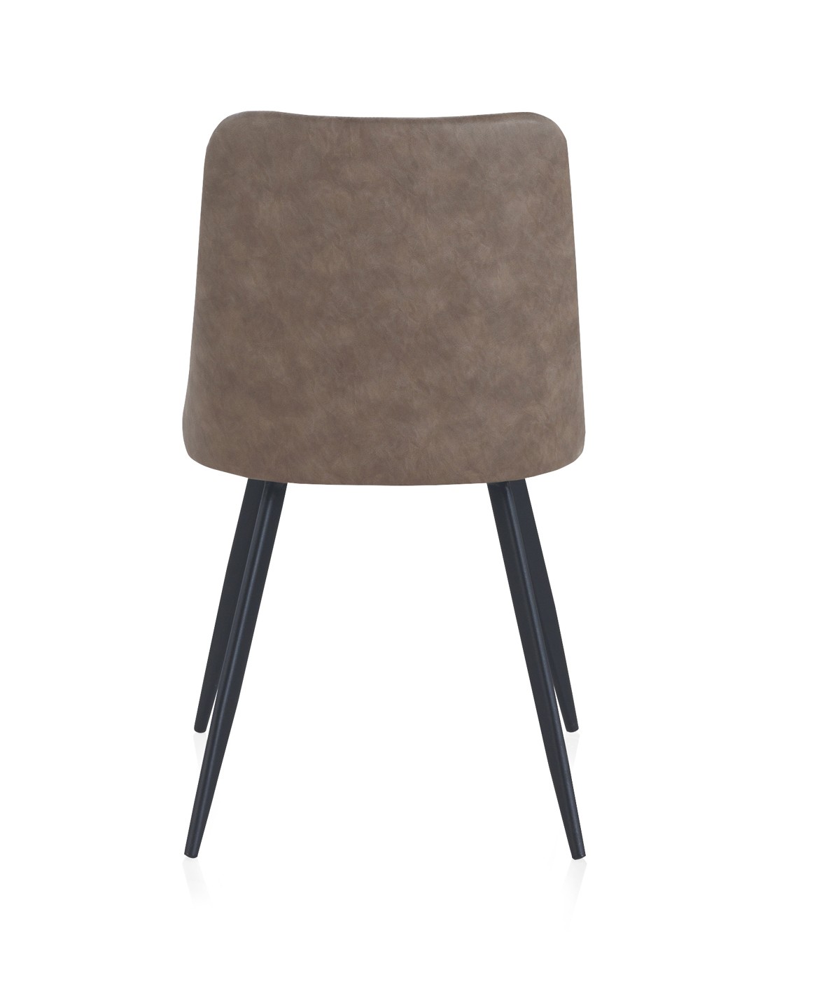Moderna, con asiento y respaldo tapizados en tejido acabado en color marrón oscuro y que a su vez, simula piel. Y le acompañan, dándole una mayor resistencia, cuatro patas en forma piramidal y diseñadas en metal finalizado en negro. Incorpora distintos pespuntes que la dotan de un acabado mucho más trabajado.