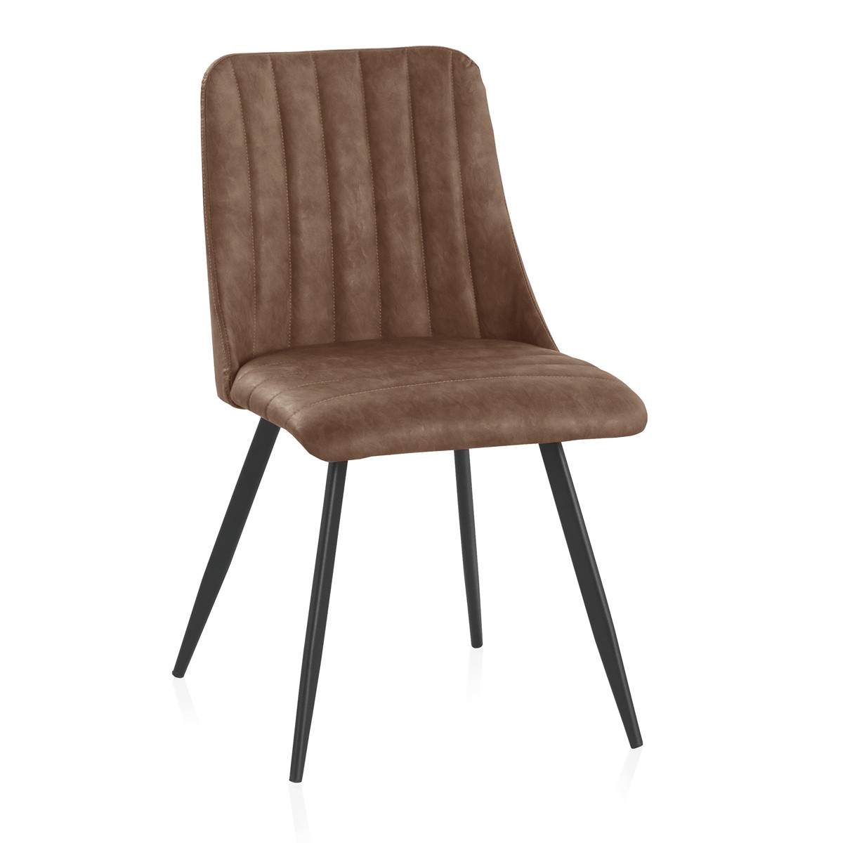 Moderna, con asiento y respaldo tapizados en tejido acabado en color marrón oscuro y que a su vez, simula piel. Y le acompañan, dándole una mayor resistencia, cuatro patas en forma piramidal y diseñadas en metal finalizado en negro. Incorpora distintos pespuntes que la dotan de un acabado mucho más trabajado.