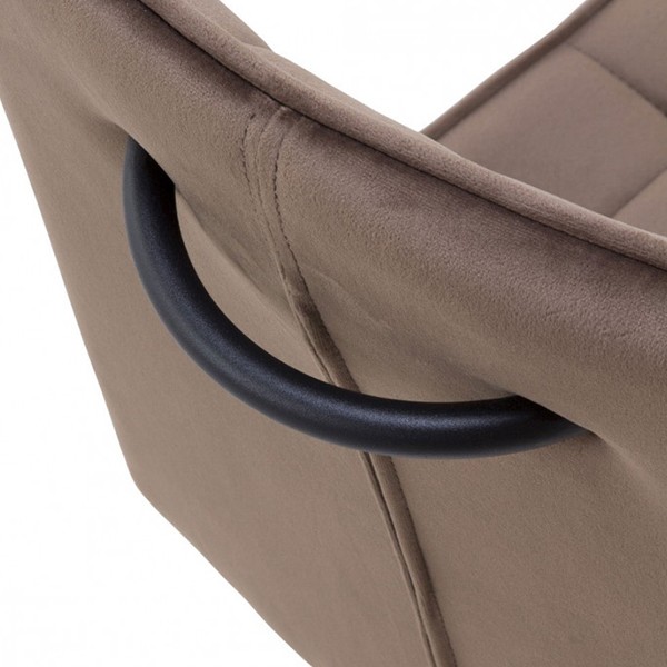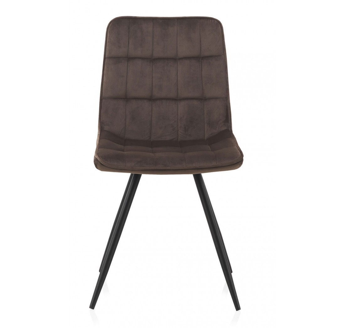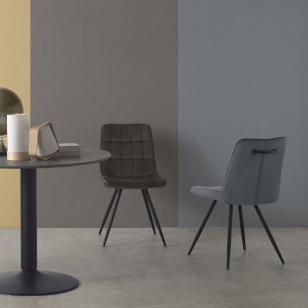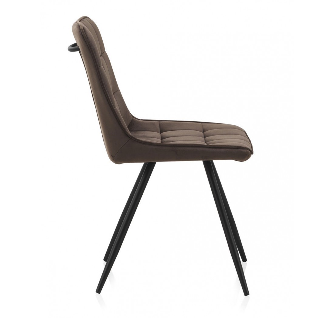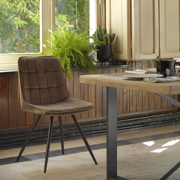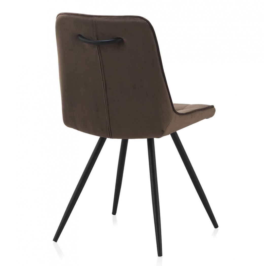 Un ejemplo lo tenemos con la silla de comedor ROSTOCK. De estilo velvet, consta de cuatro patas metálicas, acabadas en color negro. Aportan la suficiente estabilidad para soportar todo tipo de peso. Estas patas son las encargadas de sostener un asiento y un respaldo de pieza única, tapizados en tejido aterciopelado acabado en color marrón oscuro.