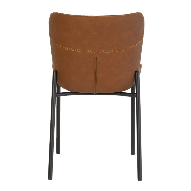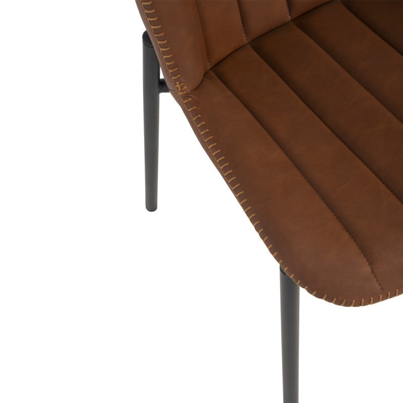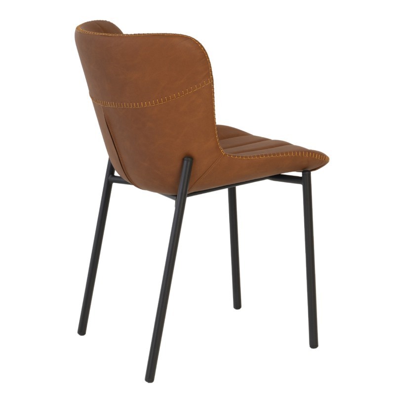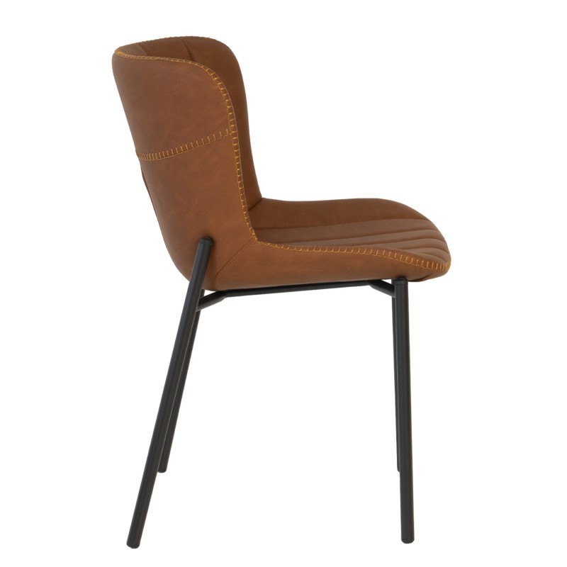 La silla de comedor ROWAN está tapizada en polipiel, en un bonito color marrón y costuras en color naranja. Además sus líneas verticales estilizan la silla aportando dinamismo y comodidad. La estructura de sus patas es tubular en metal negro.