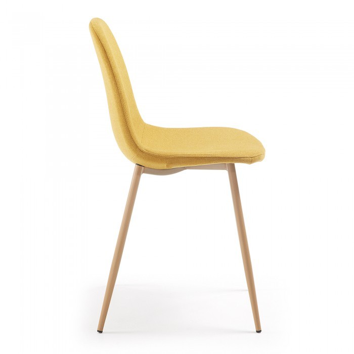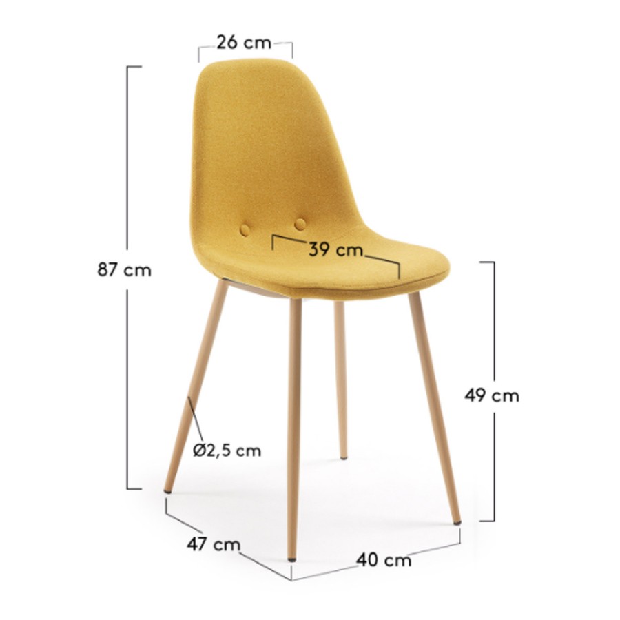 Y es que ha llegado el turno de que conozcas la silla de comedor ARAMAT. Se trata de una silla que encaja en diferentes espacios de tu hogar, pese a que la aconsejamos especialmente para salones y comedores. Está formada por un asiento y un respaldo de pieza única, tapizada en color mostaza. En la parte del respaldo, incorpora un par de botones decorativos, del mismo color, con la finalidad de dar un mejor acabado final a dicha silla.