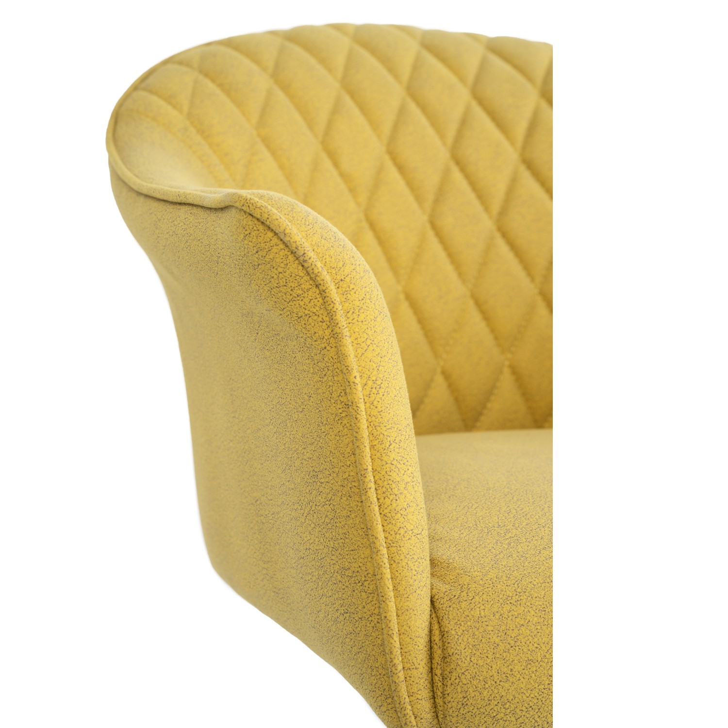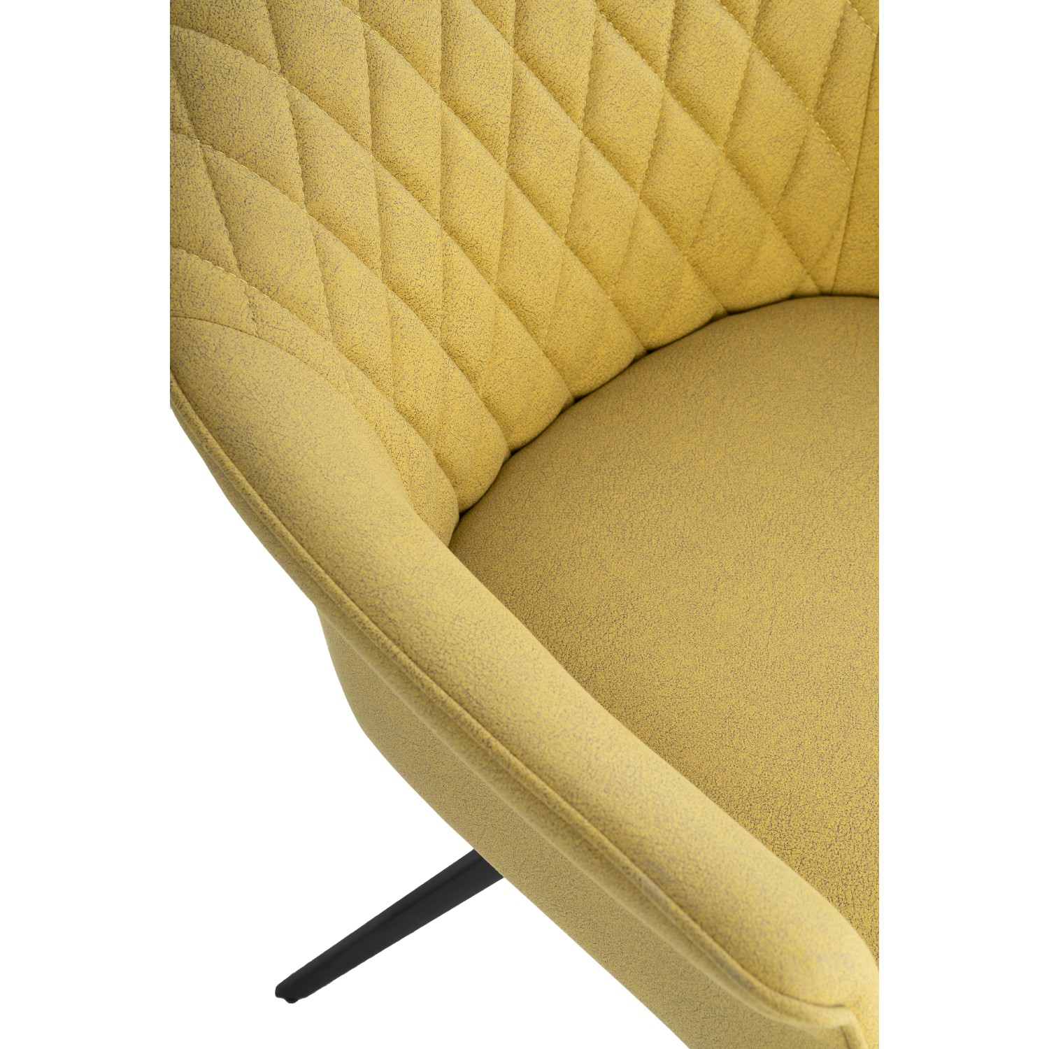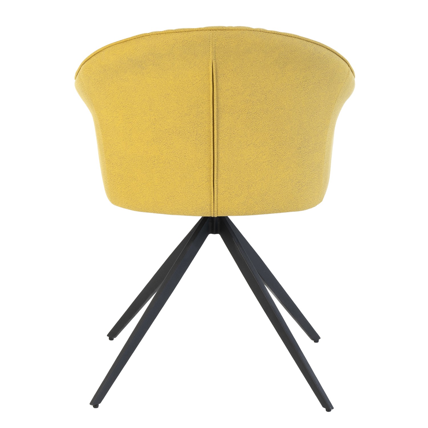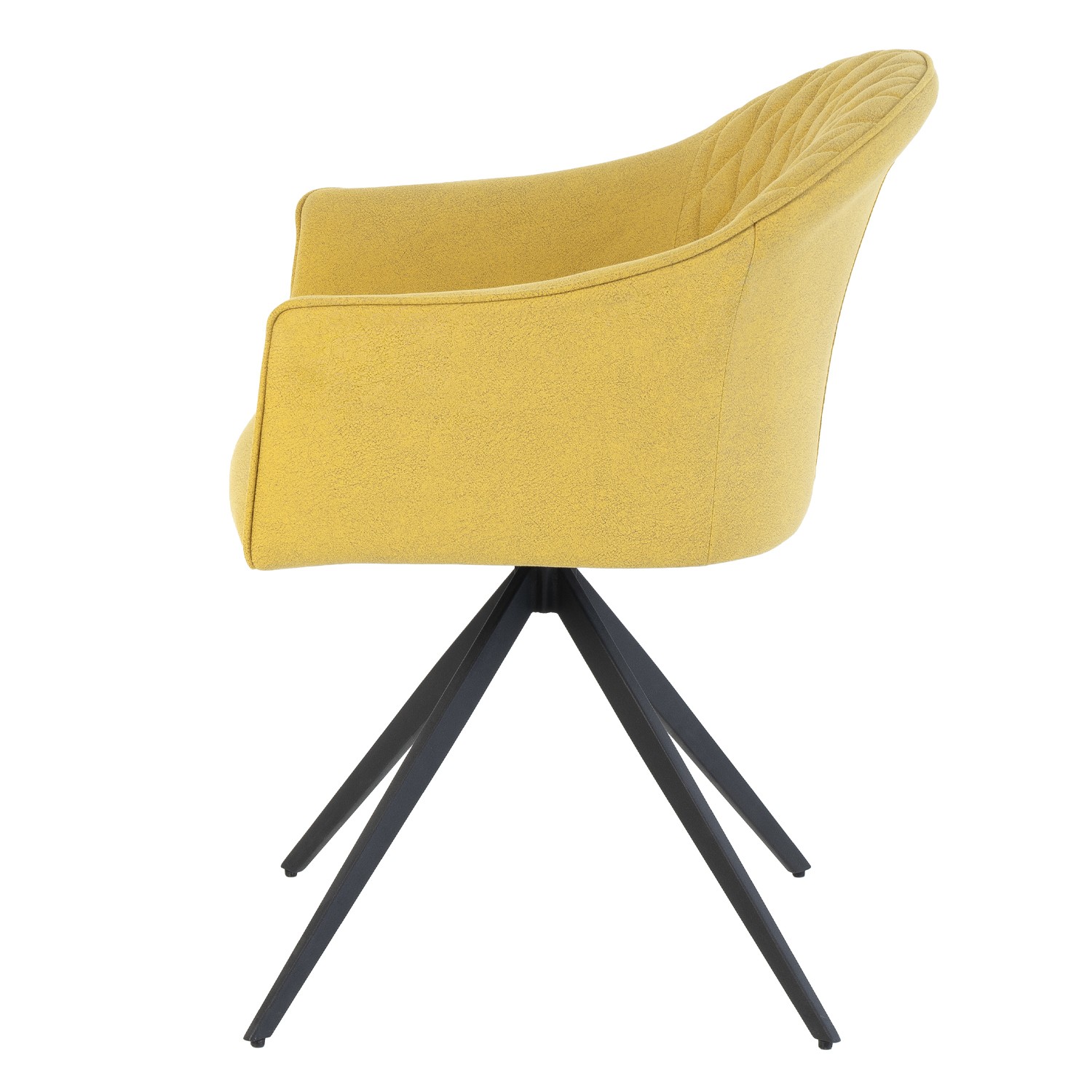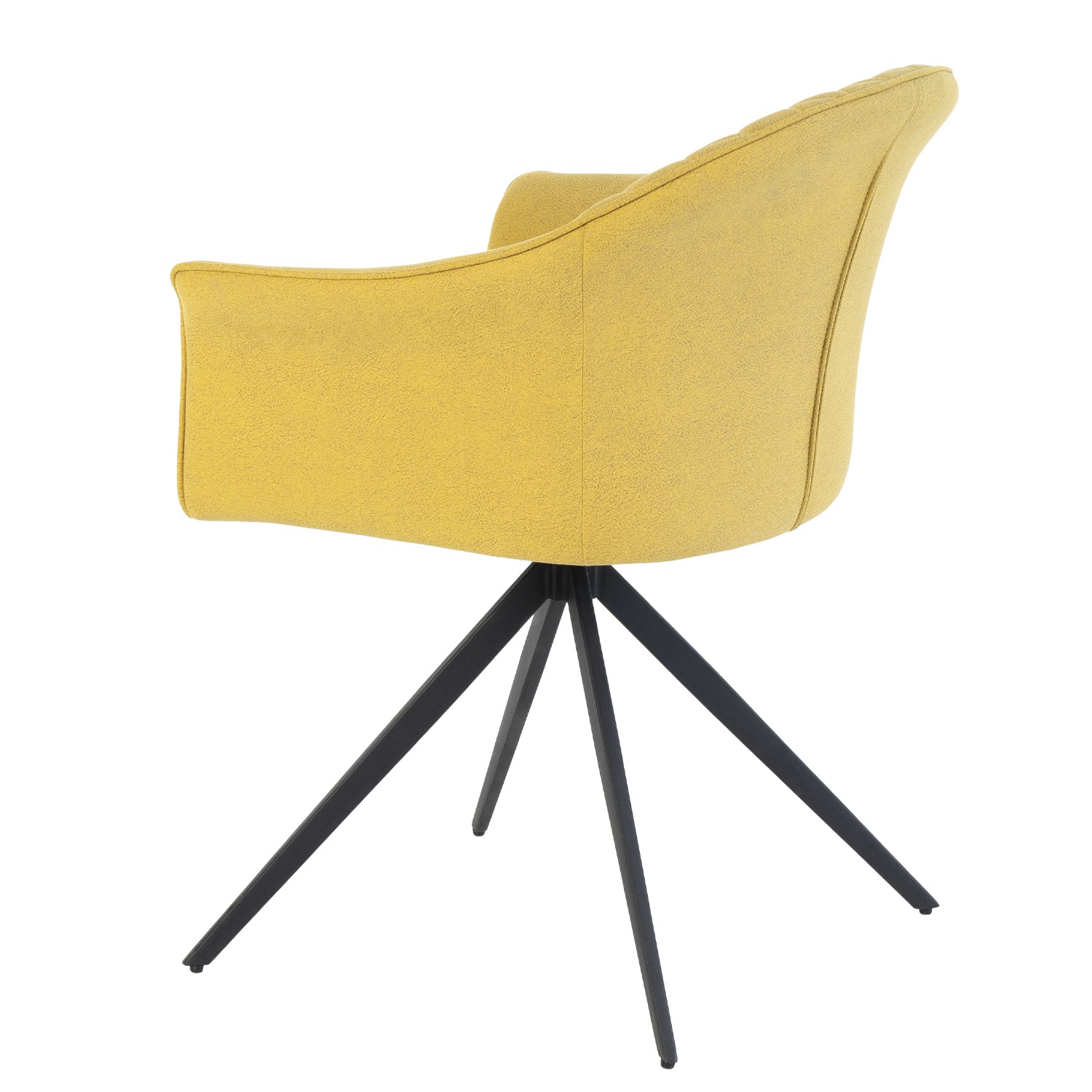 Se trata de una maravillosa silla moderna, formada por un asiento y un respaldo tapizados en tejido acabado en color mostaza, acompañado de cuatro patas metálicas negras, en forma piramidal para conseguir una mayor estabilidad. Dispone de sistema giratorio de 180º con retorno.