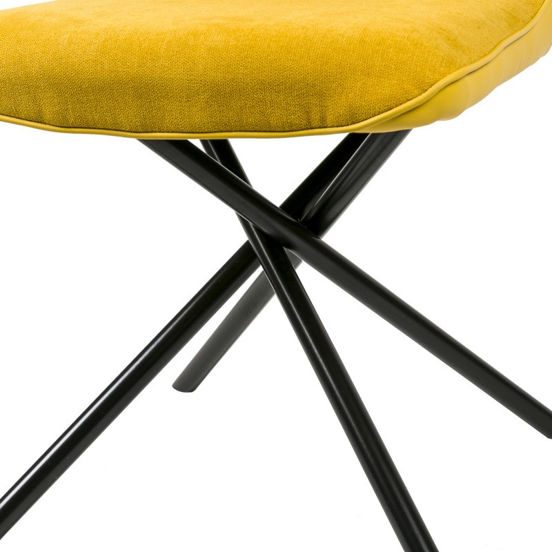 Moderna, consta de cuatro patas de metal negro y cruzadas entre sí, que acaban formando una original pirámide, con lo que se consigue una mayor estabilidad. Estas patas sostienen un asiento y un respaldo de pieza única, tapizados en dos materiales distintos: por su cara externa, en polipiel, mientras que la interna es de tejido acabado en una tonalidad muy de moda esta temporada como es el mostaza.