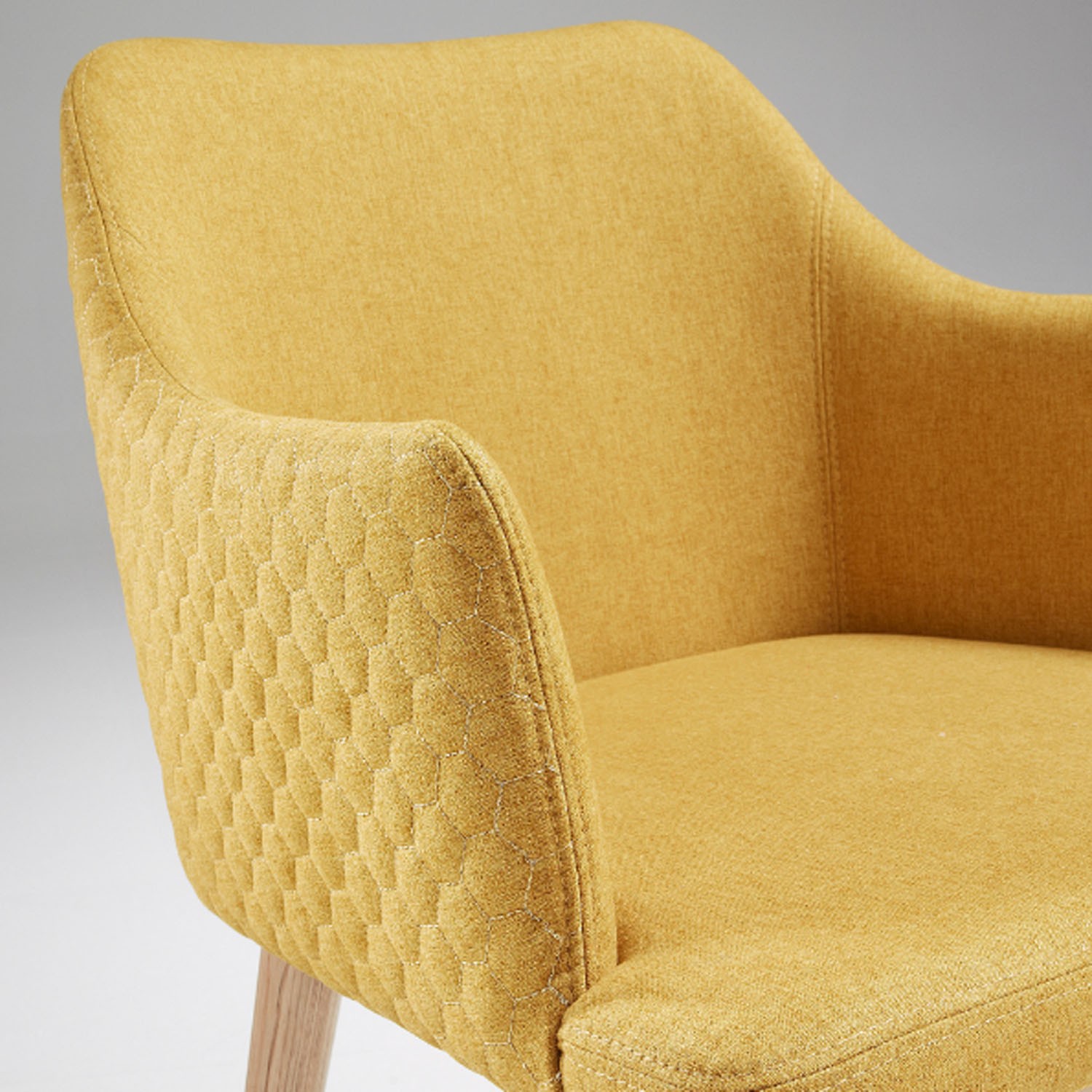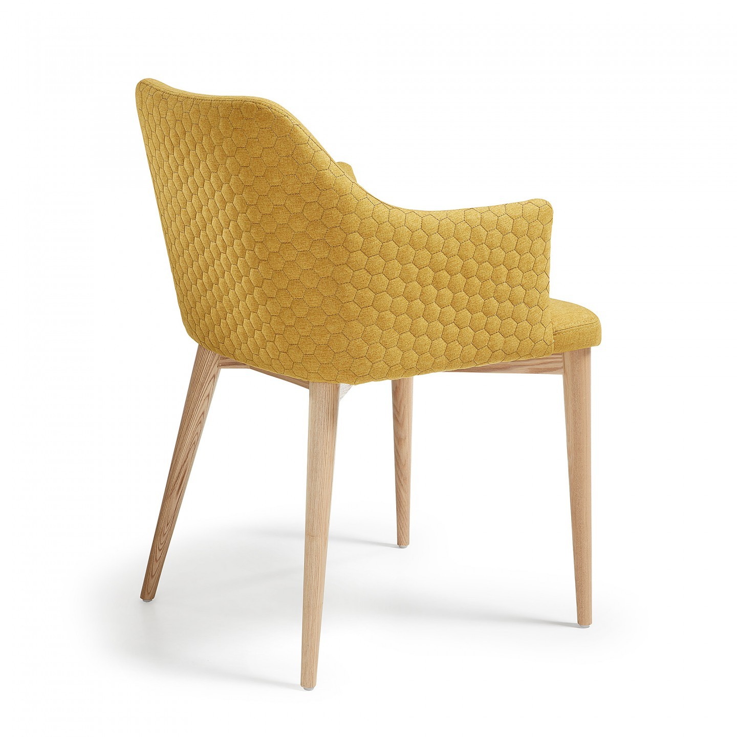 Se trata de una silla tapizada en tejido en el color comentado anteriormente, el mostaza. La parte trasera de la silla se encuentra acolchada, estéticamente mejor acabada, al igual que unos brazos que le aportan una mayor comodidad. Concluye con cuatro pies diseñados en madera de fresno macizo.