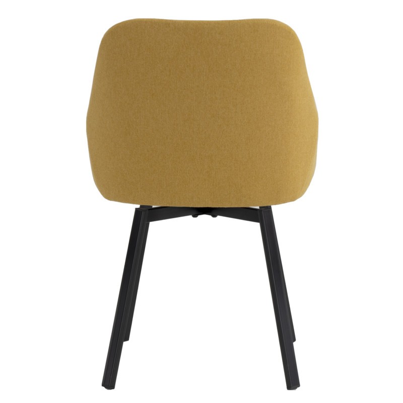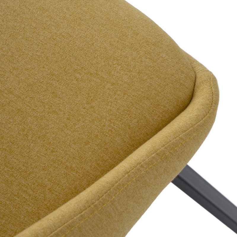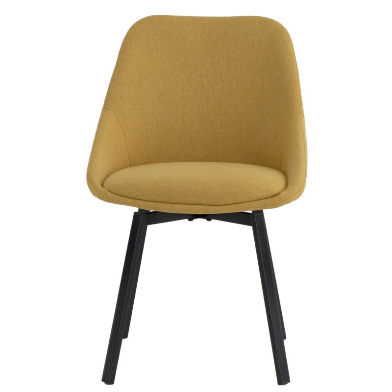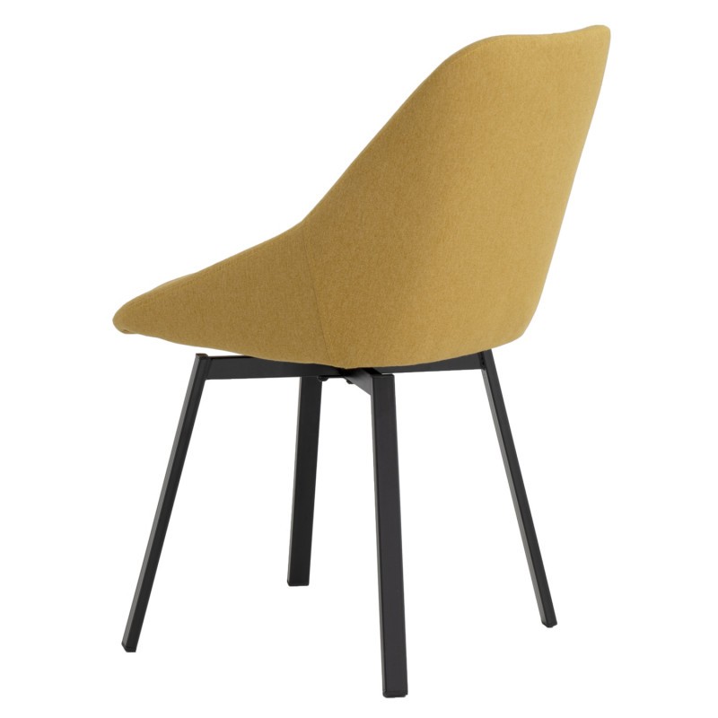 Empezando a describir la silla por la parte superior, encontramos una única pieza que forma el asiento y el respaldo. Su comodidad es inigualable por su grosor de acolchado tanto en el asiento como en el respaldo. El tapizado en tejido de color mostaza le aportará vida a tu hogar o negocio. Su característica clave es que su asiento gira 360 grados, con lo que te facilitará su movilidad, además de darle un aire moderno.