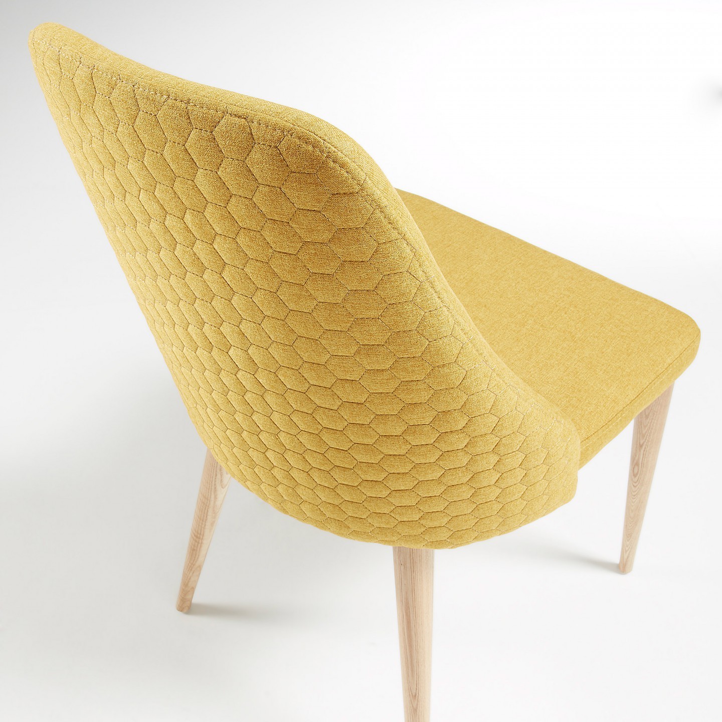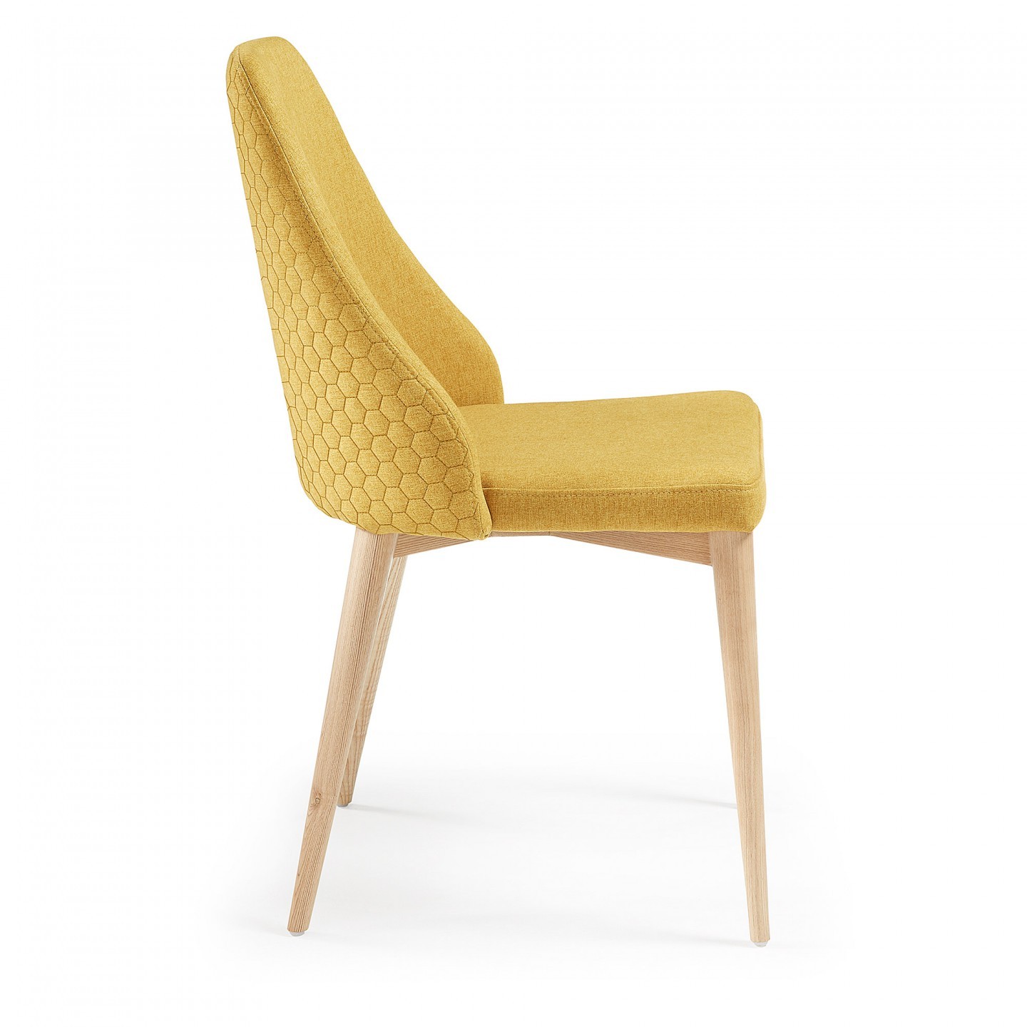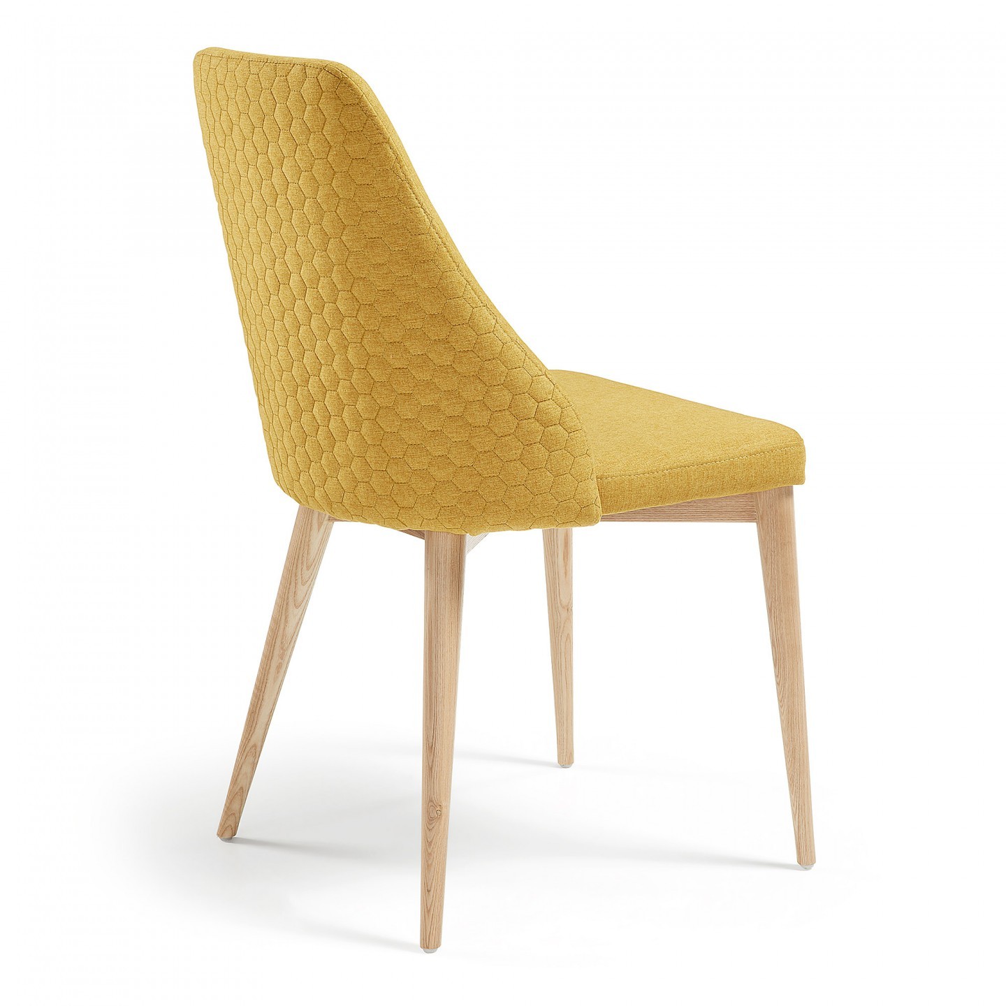 Una interesante silla tapizada en tejido antimanchas color mostaza con la parte posterior del asiento acolchada para ofrecer a sus usuarios un mayor confort y, concluyendo con cuatro pies de madera de fresno natural.