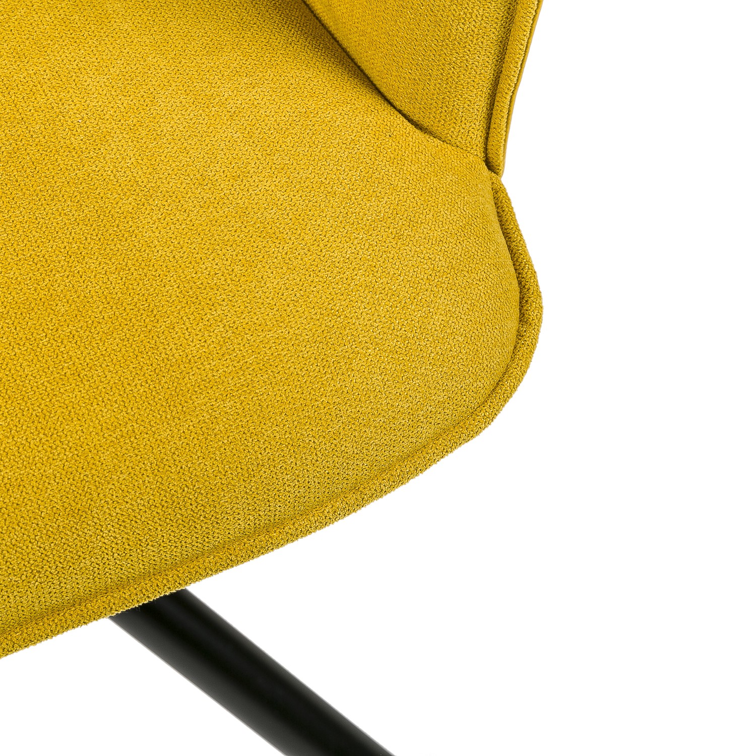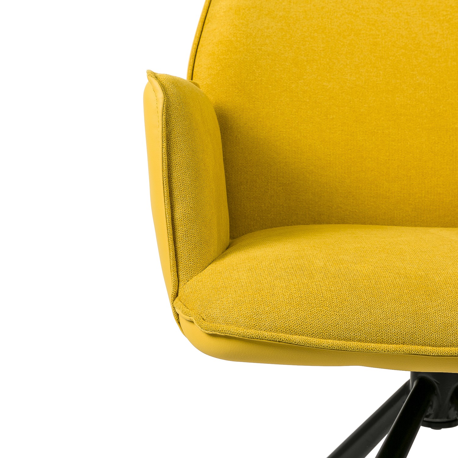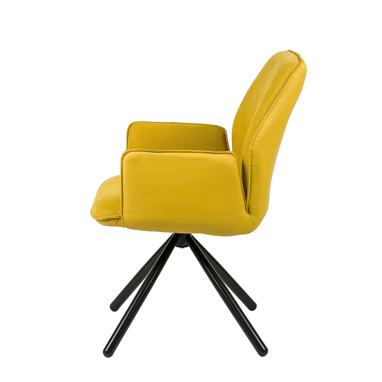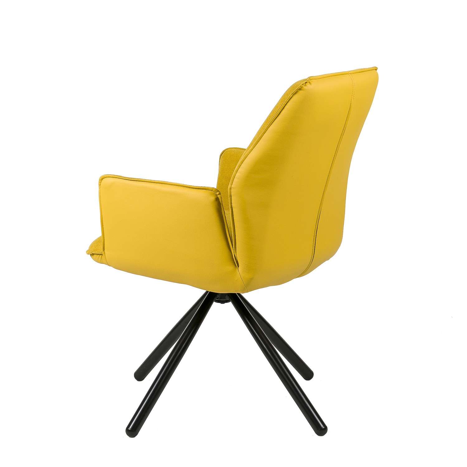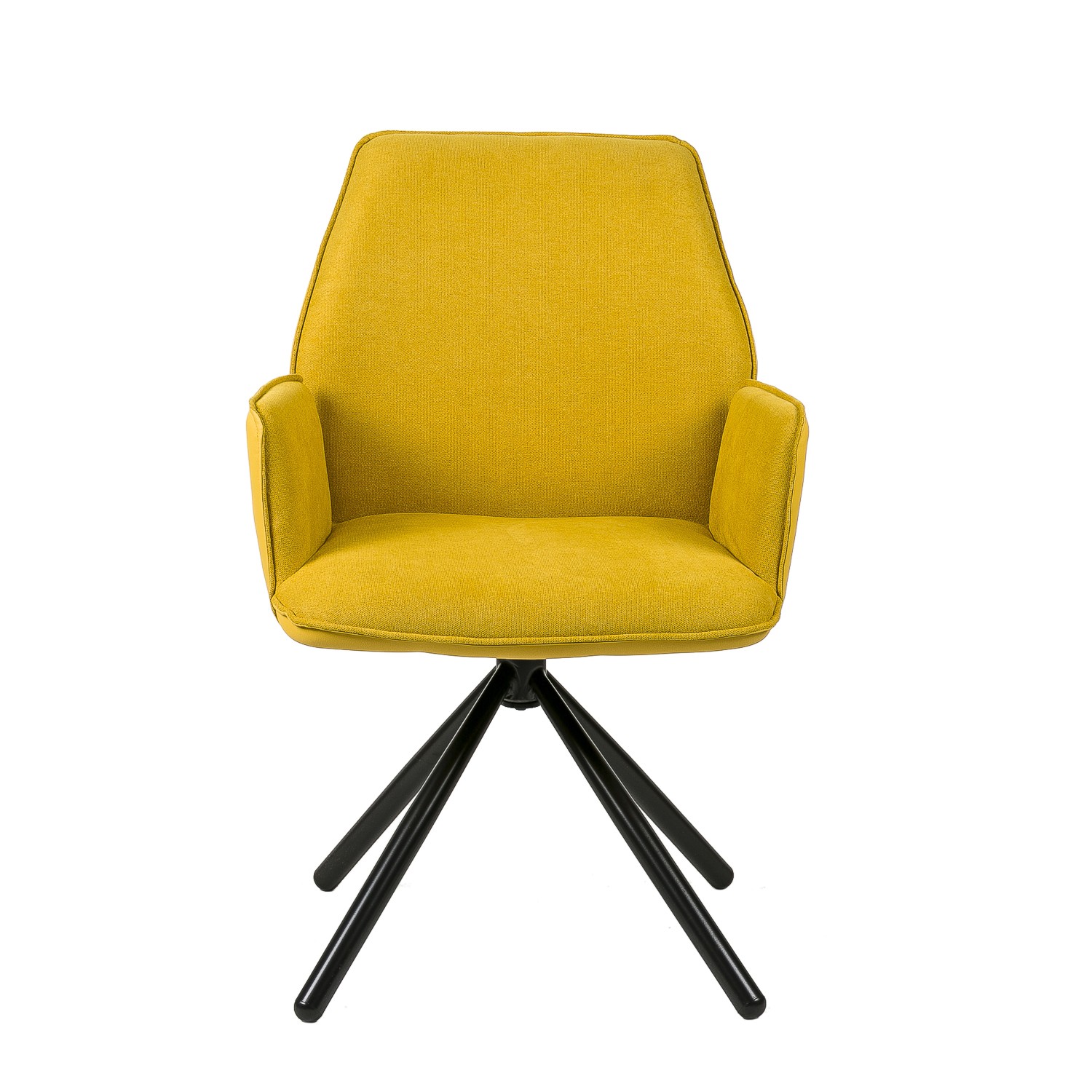 Hablamos de un modelo giratorio, formado por un asiento y un respaldo tapizados en tejido en su cara interior y en polipiel en la exterior, siendo el color mostaza el escogido para su acabado final. Le acompañan cuatro patas metálicas negras, presentadas en forma piramidal para conseguir una mayor estabilidad.