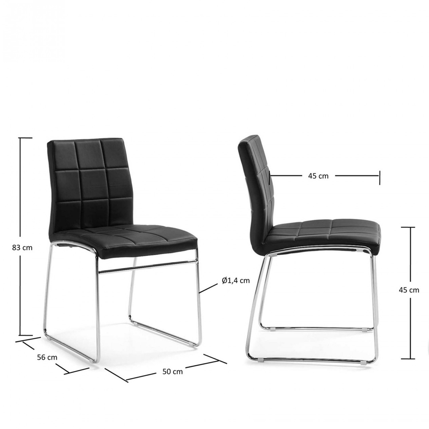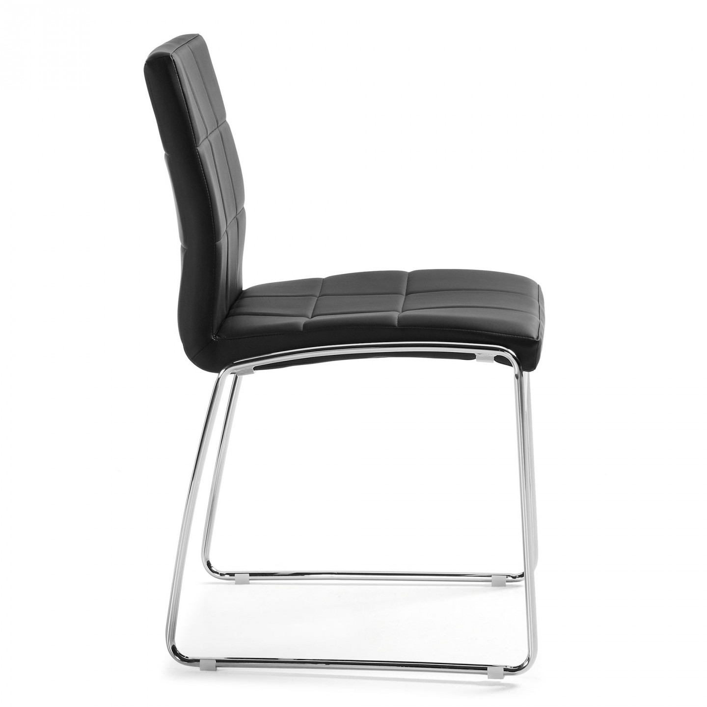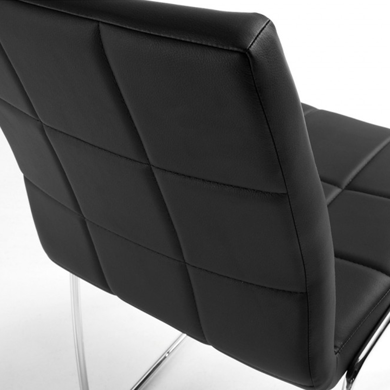 Se trata de una silla de corte clásico formada por una estructura de dos patas de metal cromado en forma patín que culmina con un asiento y un respaldo tapizado en polipiel en color negro. Para un mejor acabado, cosidos decorativos en ambos.
