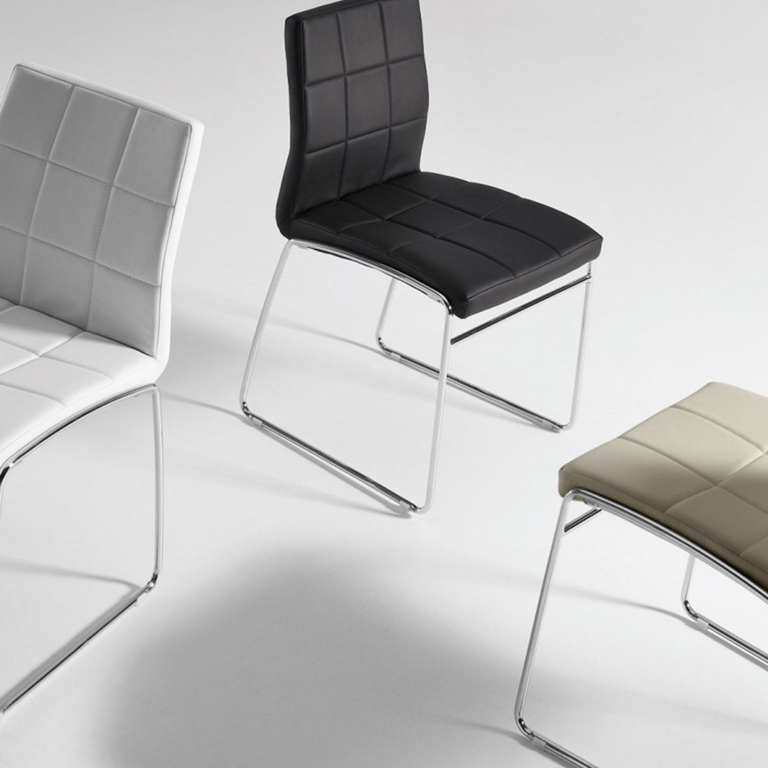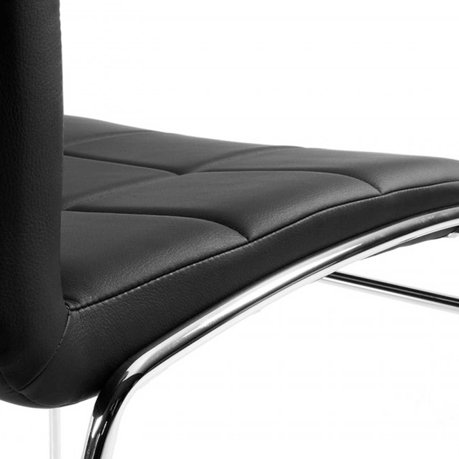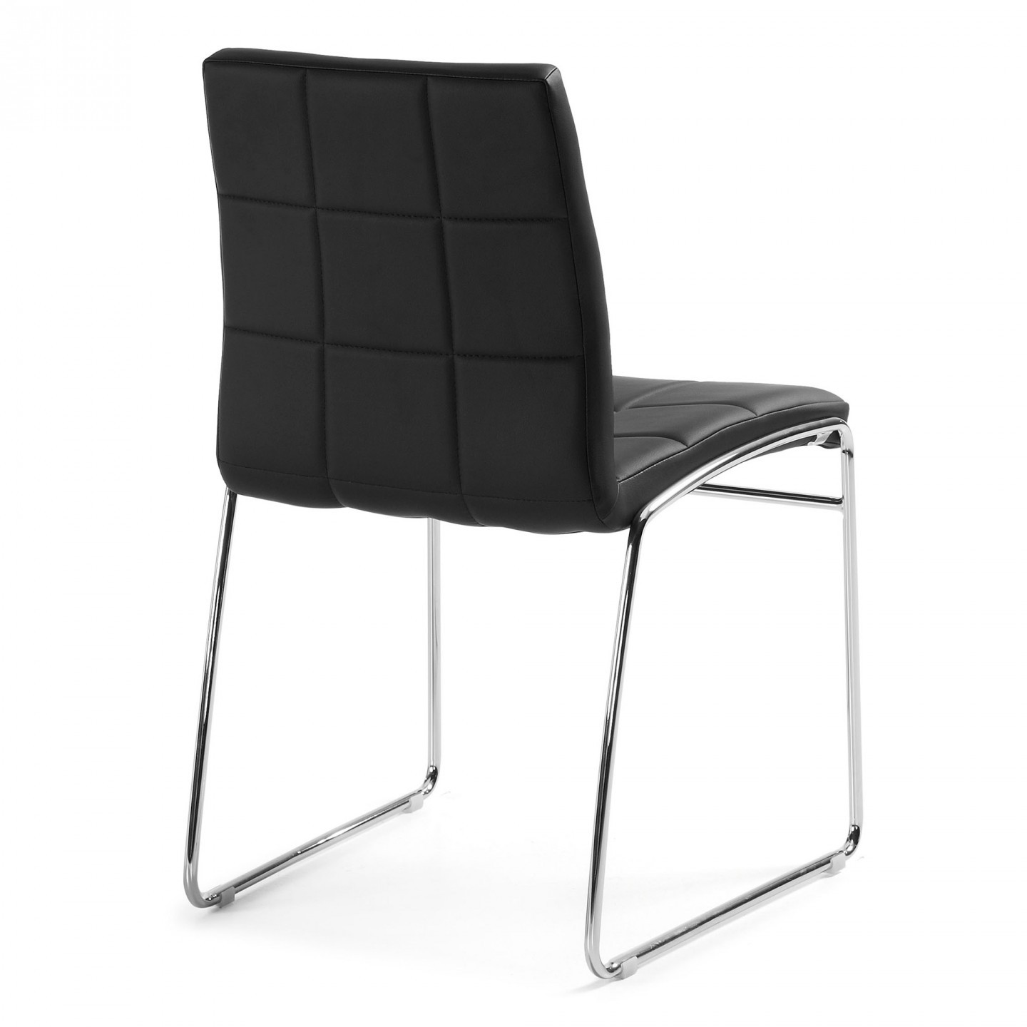 Se trata de una silla de corte clásico formada por una estructura de dos patas de metal cromado en forma patín que culmina con un asiento y un respaldo tapizado en polipiel en color negro. Para un mejor acabado, cosidos decorativos en ambos.