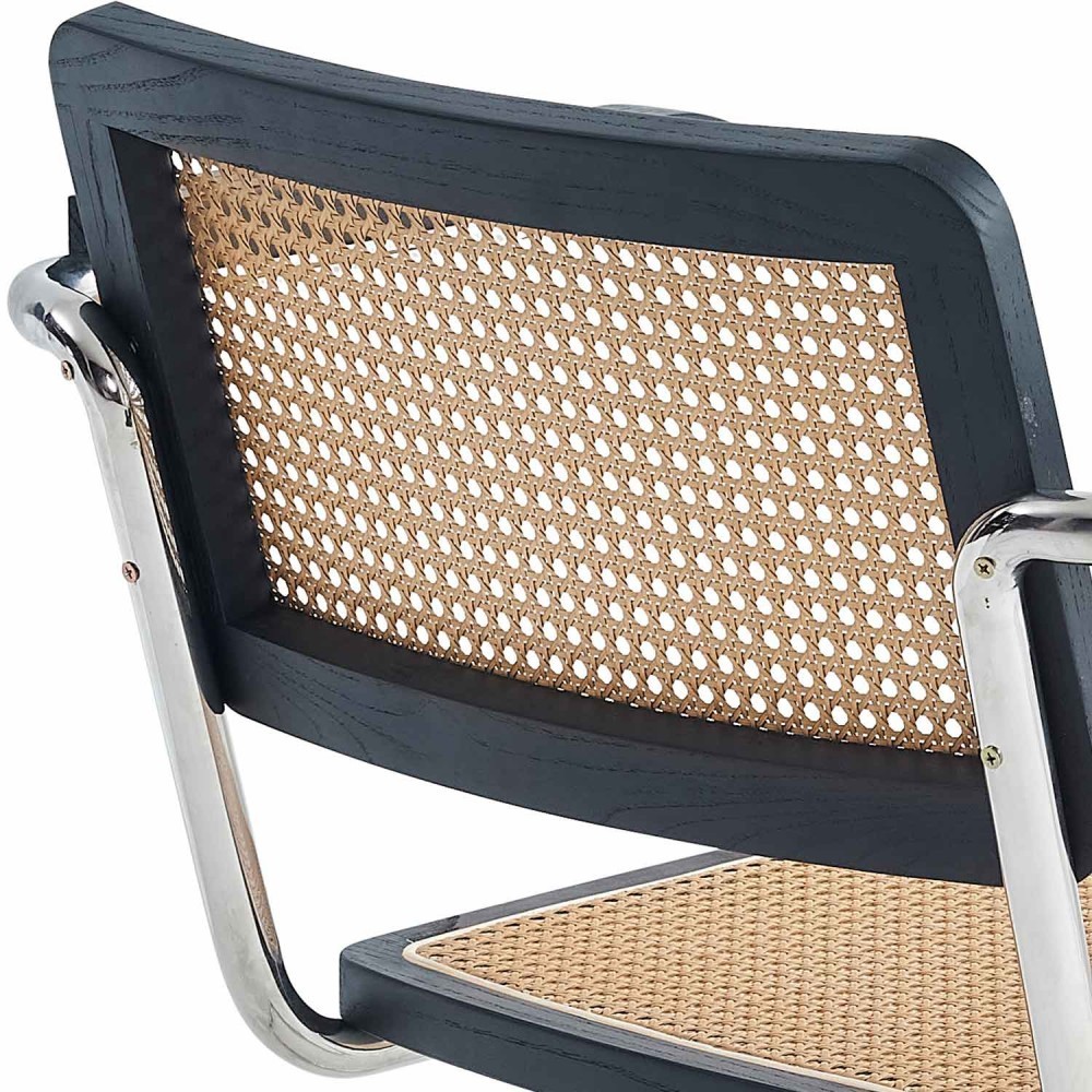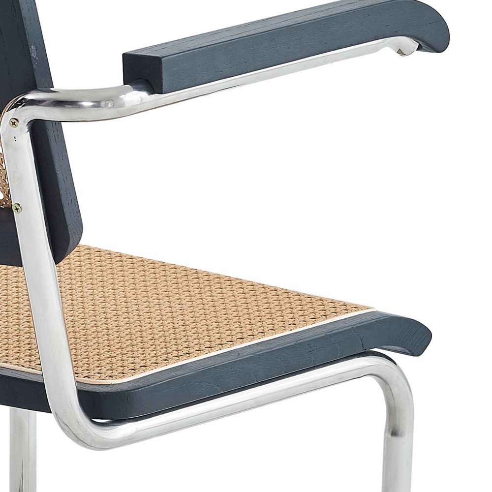 La silla de comedor Negro CESCA Style II ARMS está fabricado su asiento y respaldo en madera de olmo lacada en color negro, con ratán en tonalidad natural y estructura curvada y tubular que caracteriza a esta inspiración de la famosa silla de los años 20, la silla CESCA, diseño del creador de iconos de la moda del mobiliario Marcel BREUER.