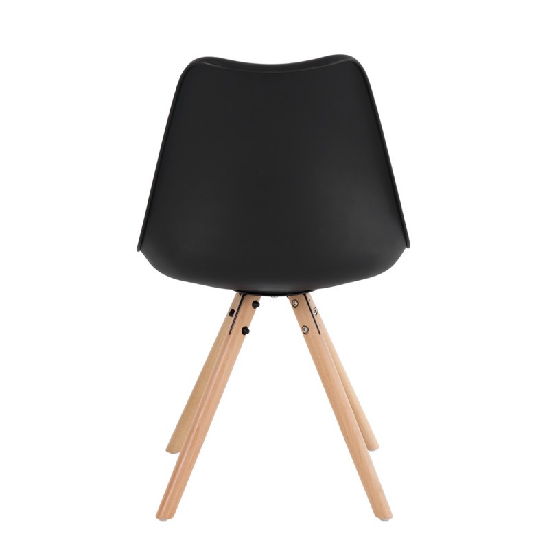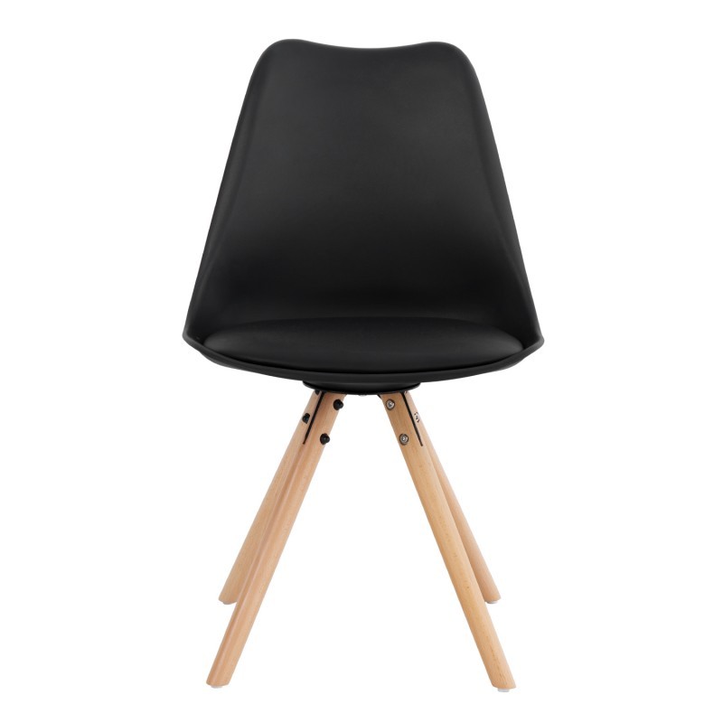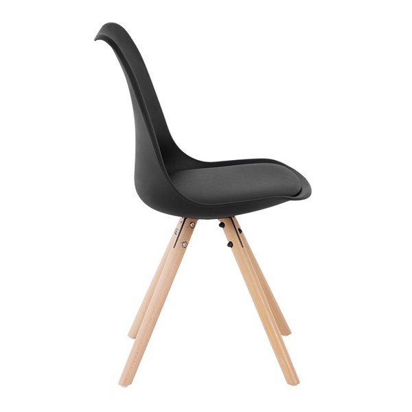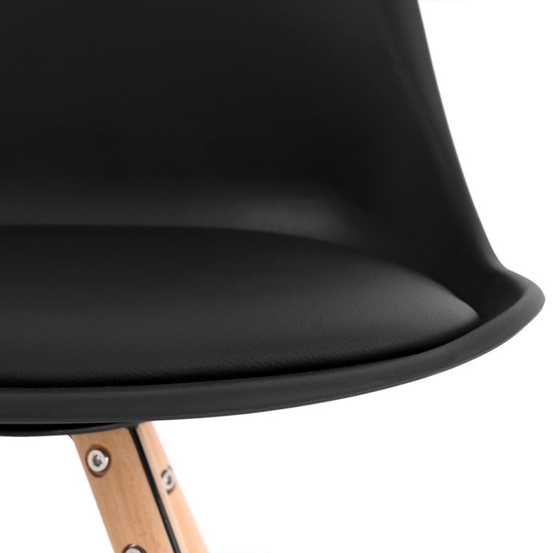 La silla de comedor FLAK está fabricada en plástico negro con cojín tapizado en polipiel del mismo color y tiene unos pies en forma de trípode hechos en madera de haya barnizada, la cual nos recuerdan a otros diseños como es la famosa silla DSW.