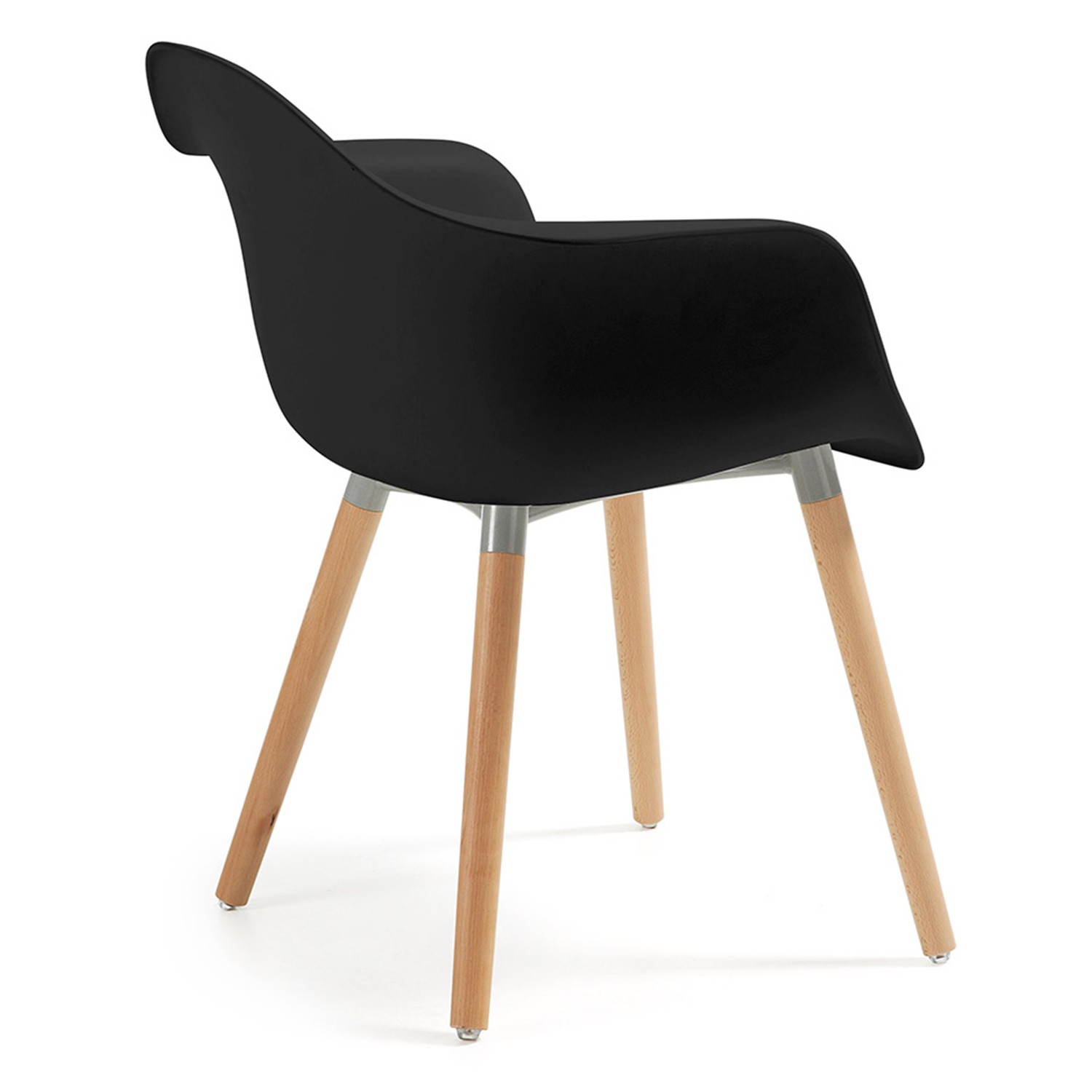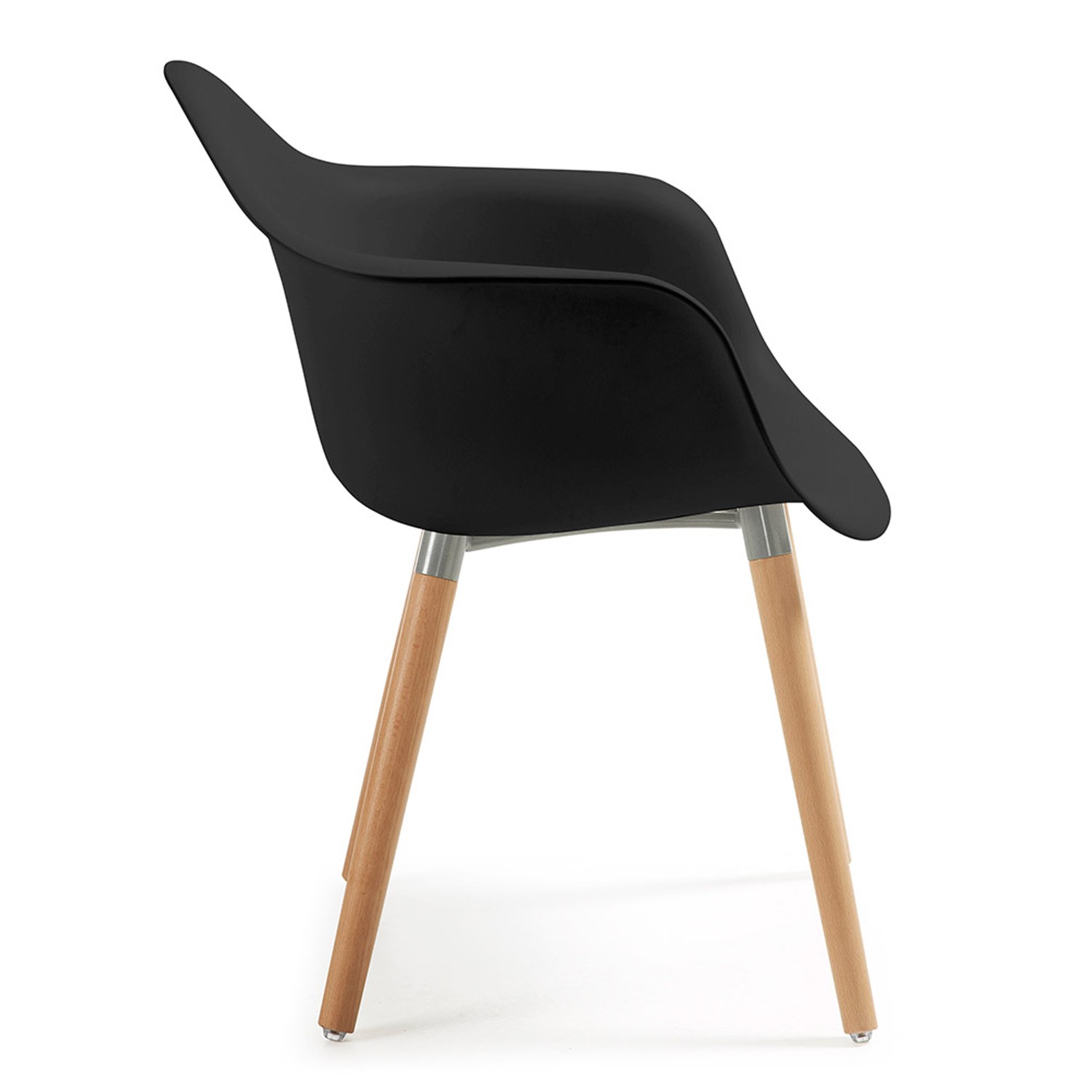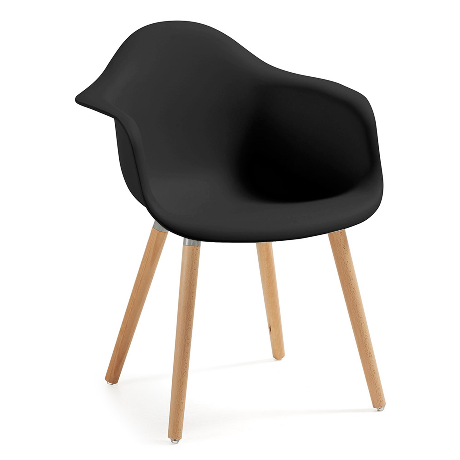 Su asiento, con reposabrazos, en formas curvas y redondeadas está fabricado en polipropileno en color negro. Sus resistentes patas le dan un toque más cálido a tu hogar al estar fabricadas en madera de haya maciza natural.