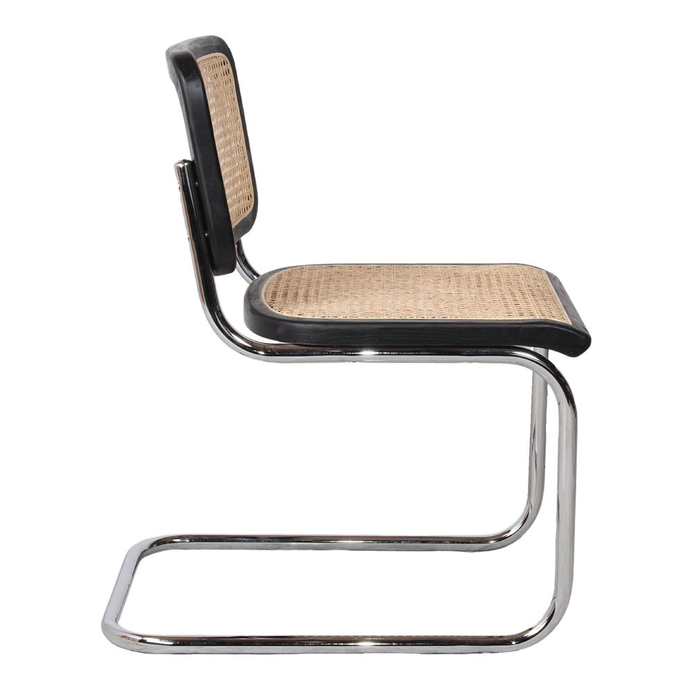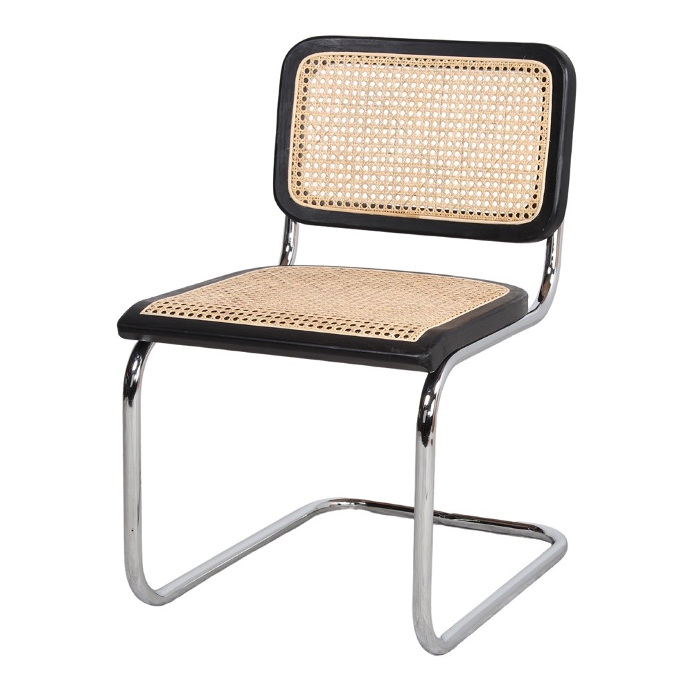 Nuestra silla de comedor CESCA está fabricada en madera de olmo natural en acabado en color negro, estructura tubular de acero cromado y rejilla de rattan natural.