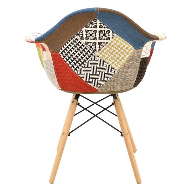 La silla TOW WOOD ARMS inspirada en la silla DAW de Charles & Ray Eames se reinventa con un tapizado total, tanto por delante como por detrás, en distintas telas cosidas a mano en su asiento y respaldo con reposabrazos integrado en la misma pieza.