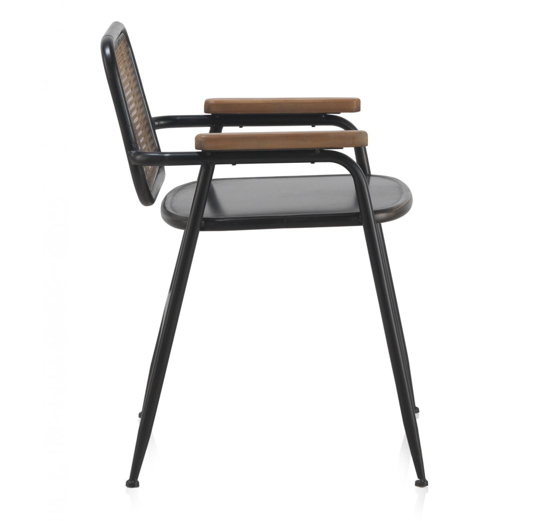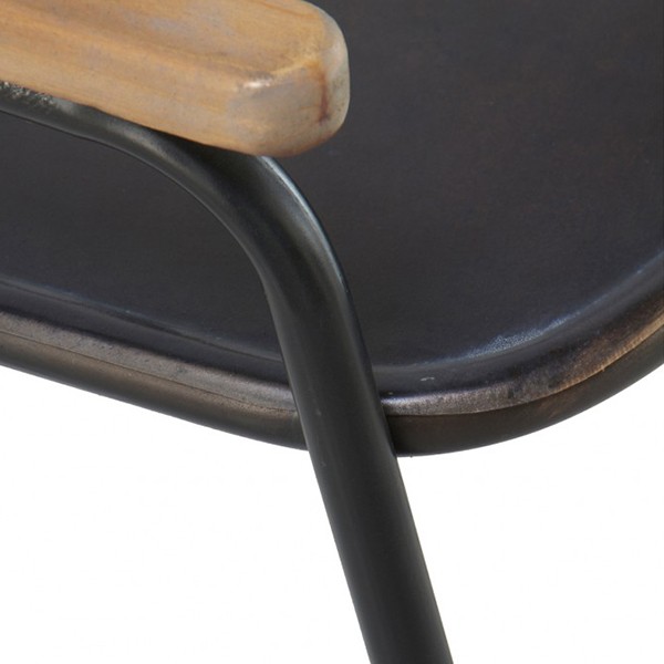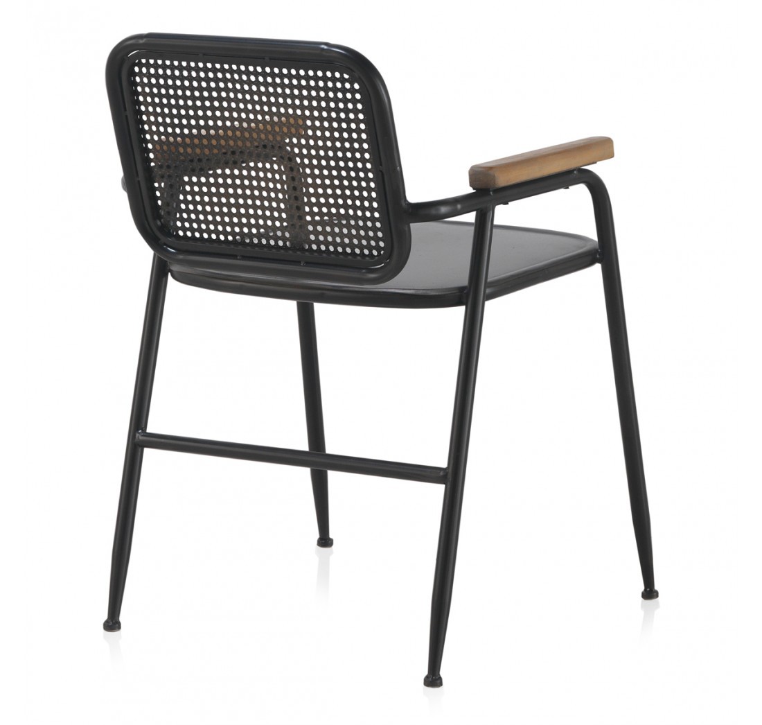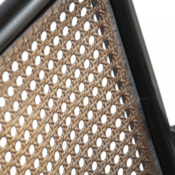 Está fabricada con una estructura de chapa metálica color negro y respaldo en bronce, contrastando con madera en sus reposabrazos. Sus materiales le dotan de durabilidad y belleza. Aún tener un material industrial como el metal, nos proporciona calidez por sus líneas redondeadas y su patrón en el respaldo que nos lleva a épocas de antaño.