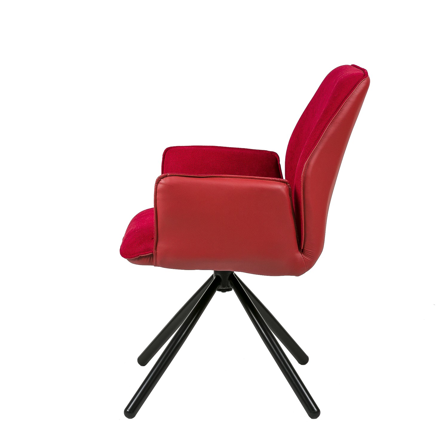 Un modelo claramente destinado a todo tipo de salones y comedores, giratorio, y que consta de un asiento y un respaldo tapizados en tejido en su cara interior y en polipiel en la exterior, acompañado de cuatro patas colocadas en forma piramidal para conseguir una mayor estabilidad y realizadas en metal negro.