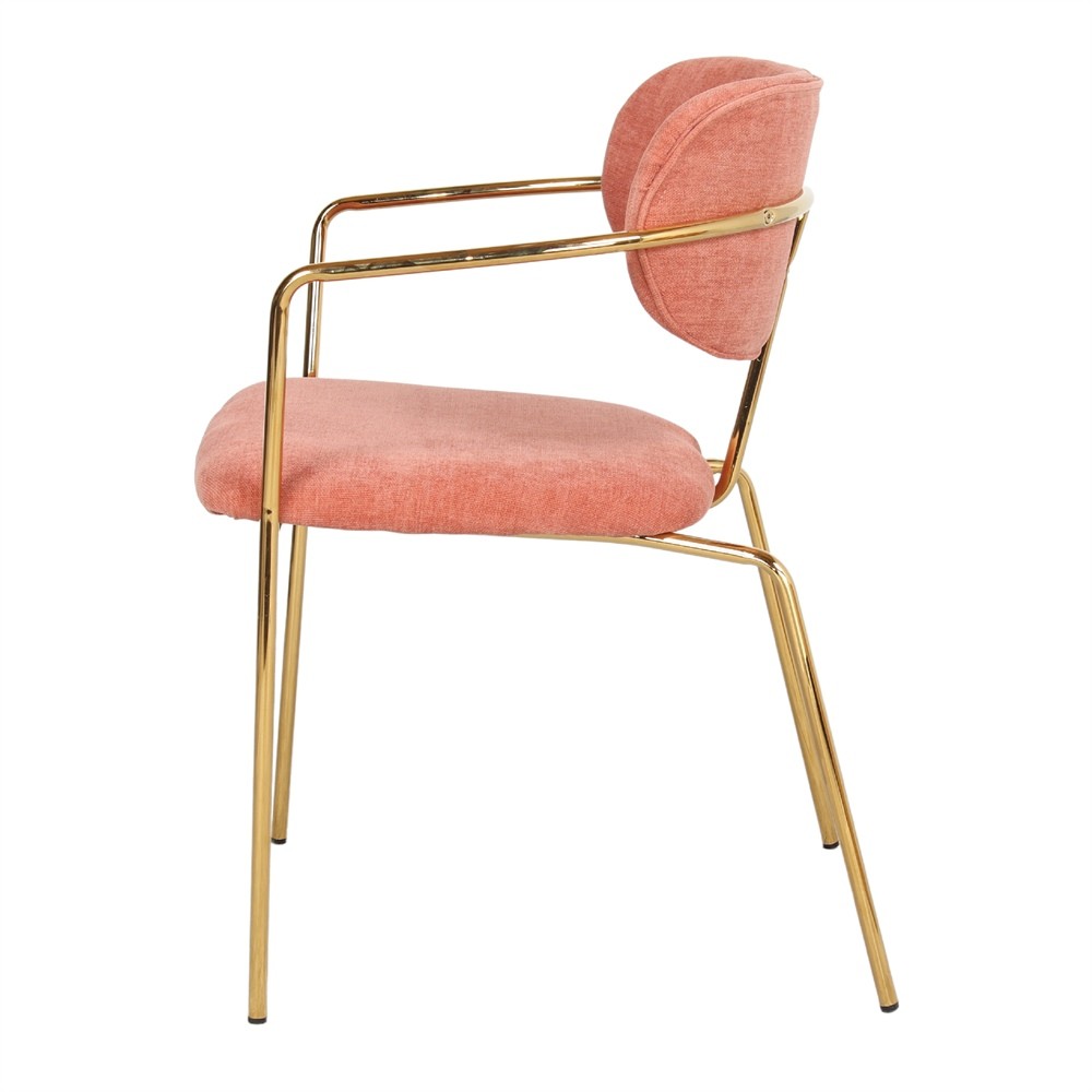 La silla de comedor FLORENCIA es una silla con asiento y respaldo tapizados en tejido color rosa que se sostiene mediante una estructura tubular metálica con un acabado lacado en color oro. Te sentirás muy confortable al sentarse ya que está acolchada en espuma. Además, dispone de reposabrazos para que las tertulias de sobremesa sean más llevaderas en compañía de tus amigos y/o familiares. Aparentemente, puede parecer una silla sencilla, pero por sus características se convertirá en el elemento protagonista en la decoración de tu hogar o de tu negocio. Nuestra silla de comedor FLORENCIA también está disponible en otros colores, atrévete con un toque de elegancia y seriedad.