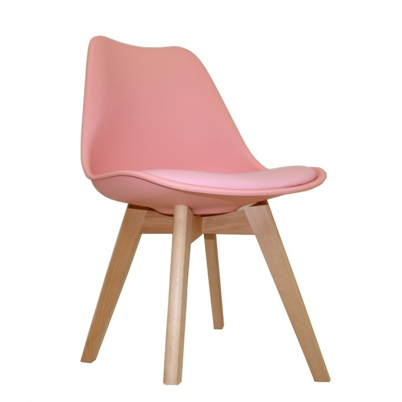 La silla de comedor SUPER FLAK tiene una estructura elaborada a partir de una sola pieza para el respaldo y asiento de polipropileno de color rosa, además su asiento dispone de un cojín de polipiel del mismo tono; su base está compuesta por cuatro patas de madera de haya natural barnizada.
