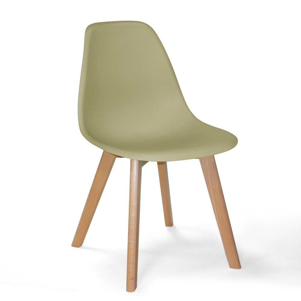 Combinando materiales como el polipropileno y la madera crean una silla ergonómica por su respaldo de una sola pieza en polipropileno y de apoyo tenemos unas patas en madera de haya en tono natural.