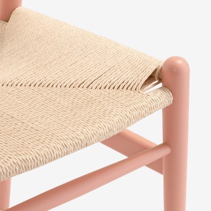 El modelo está realizado en madera de haya lacada en color rosa, tono similar al salmón y asiento reforzado en ratán trenzado ecológico. Respaldo curvado con reposabrazos unido al asiento por una pieza en forma de Y. Elegante y sencilla a la vez para el hogar o negocios de hostelería y restauración.