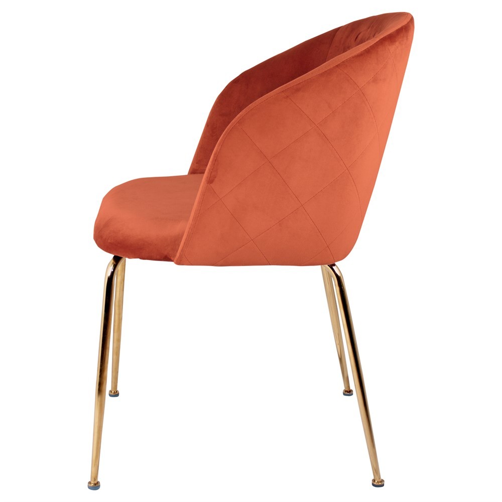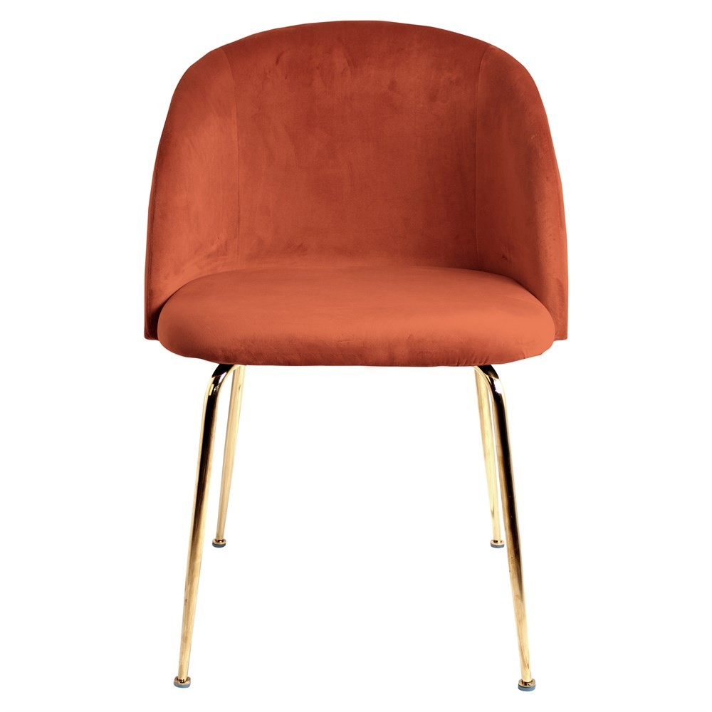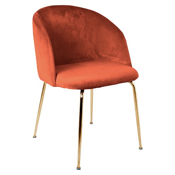 Damos la bienvenida a la silla de comedor ESENCIA, un modelo de estilo velvet que se presenta como una buena opción para interiores de estilo contemporáneo. ESENCIA es una silla con estructura de metal bañada en latón con acabado color terracota, que le aporta ese toque elegante y moderno. Su asiento, respaldo y reposabrazos son tapizados en suave terciopelo. La parte trasera de la silla dispone de unos pespuntes en forma de rombo que le aportarán mucha más esencia a la silla de comedor ESENCIA. Esta espectacular silla la puedes colocarla en cualquier estancia: en tu rincón de relax mientras lees un libro; o perfecta para tu negocio: una cafetería o restaurante que aportará un toque de elegancia y sofisticación. En nuestra web también podrás encontrar este modelo de silla en otros acabados.