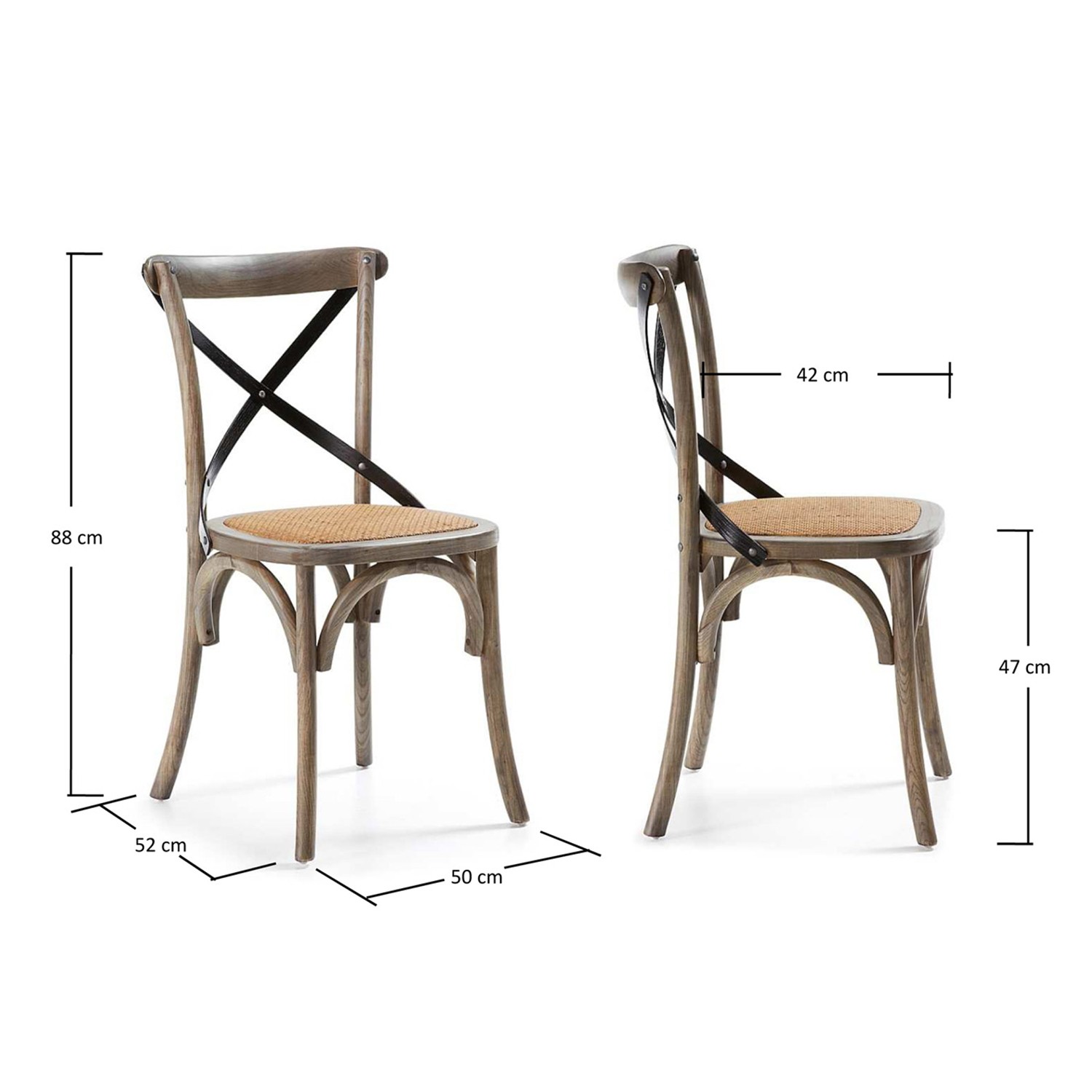Color: Gris y negro. Materiales: Madera y ratán. Medidas: Medida alto: 88 cm. Medida ancho: 50 cm. Medida profundo: 52 cm. Medida asiento: 47 cm.