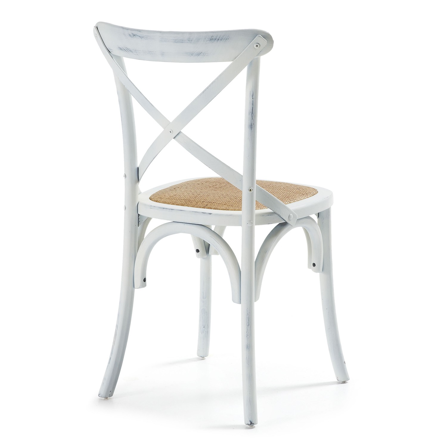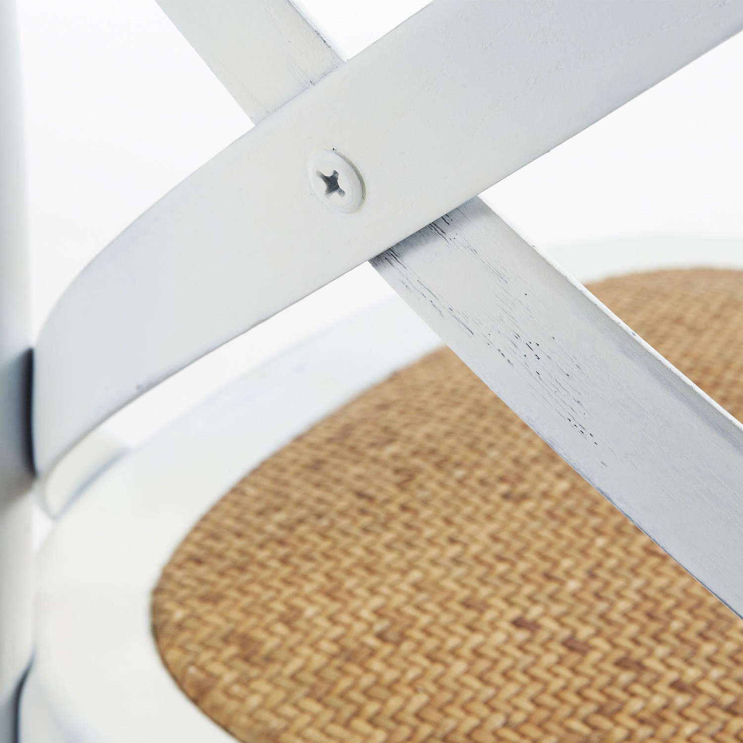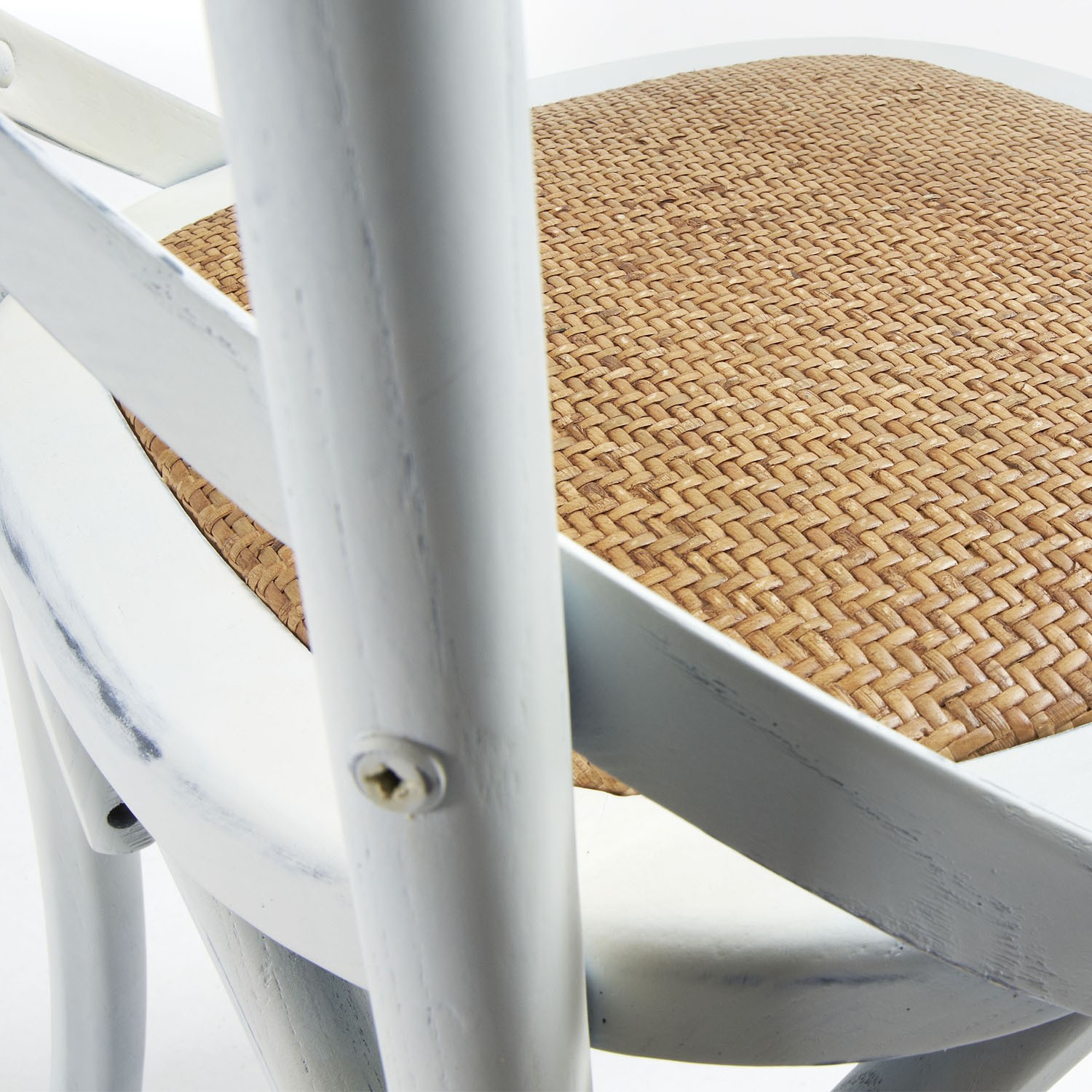 Silla de estructura completamente en madera de olmo en blanco, con técnica de desgastado para darle un toque más antiguo. Respaldo con cruceta para mayor estabilidad y asiento en ratán en tono natural, una combinación perfecta.