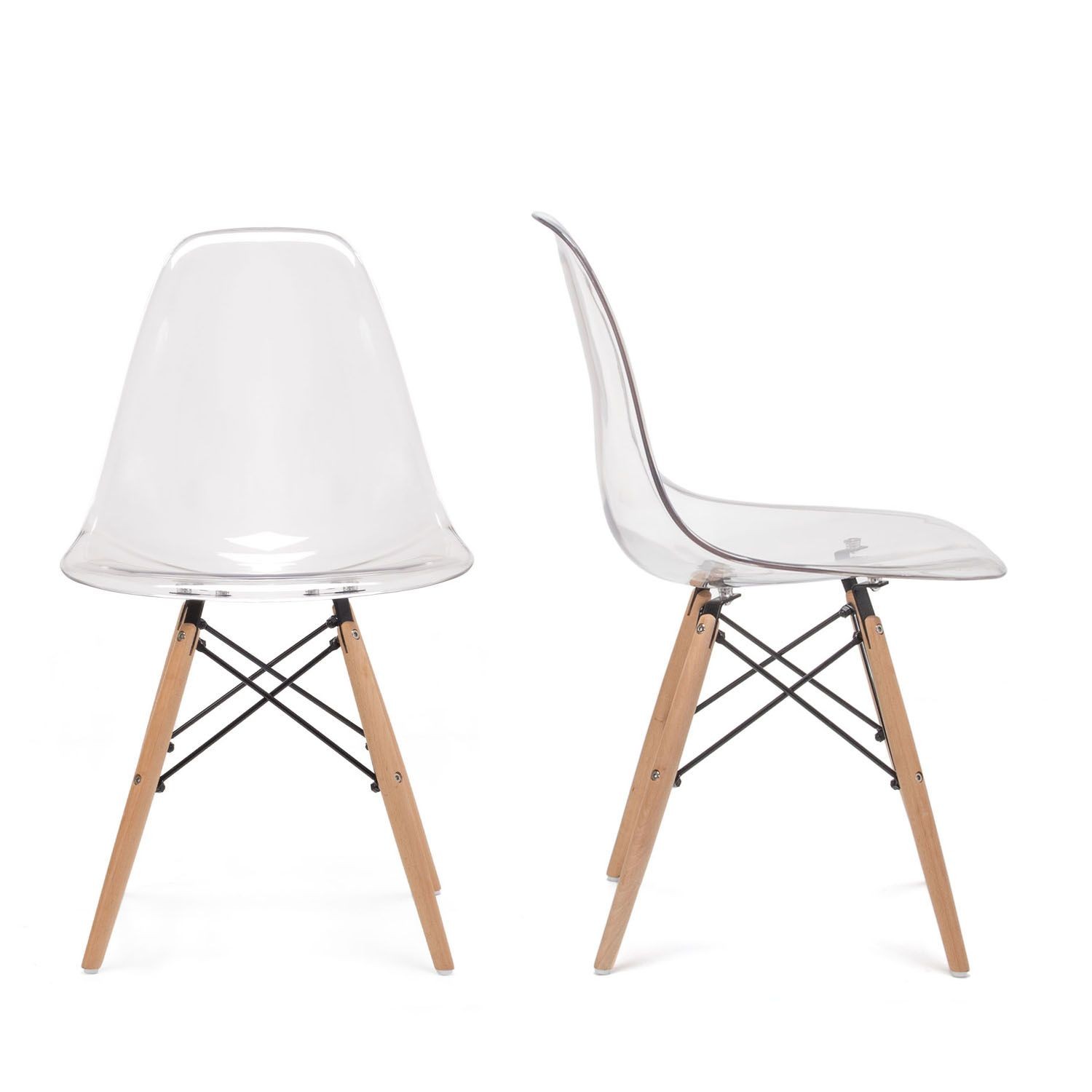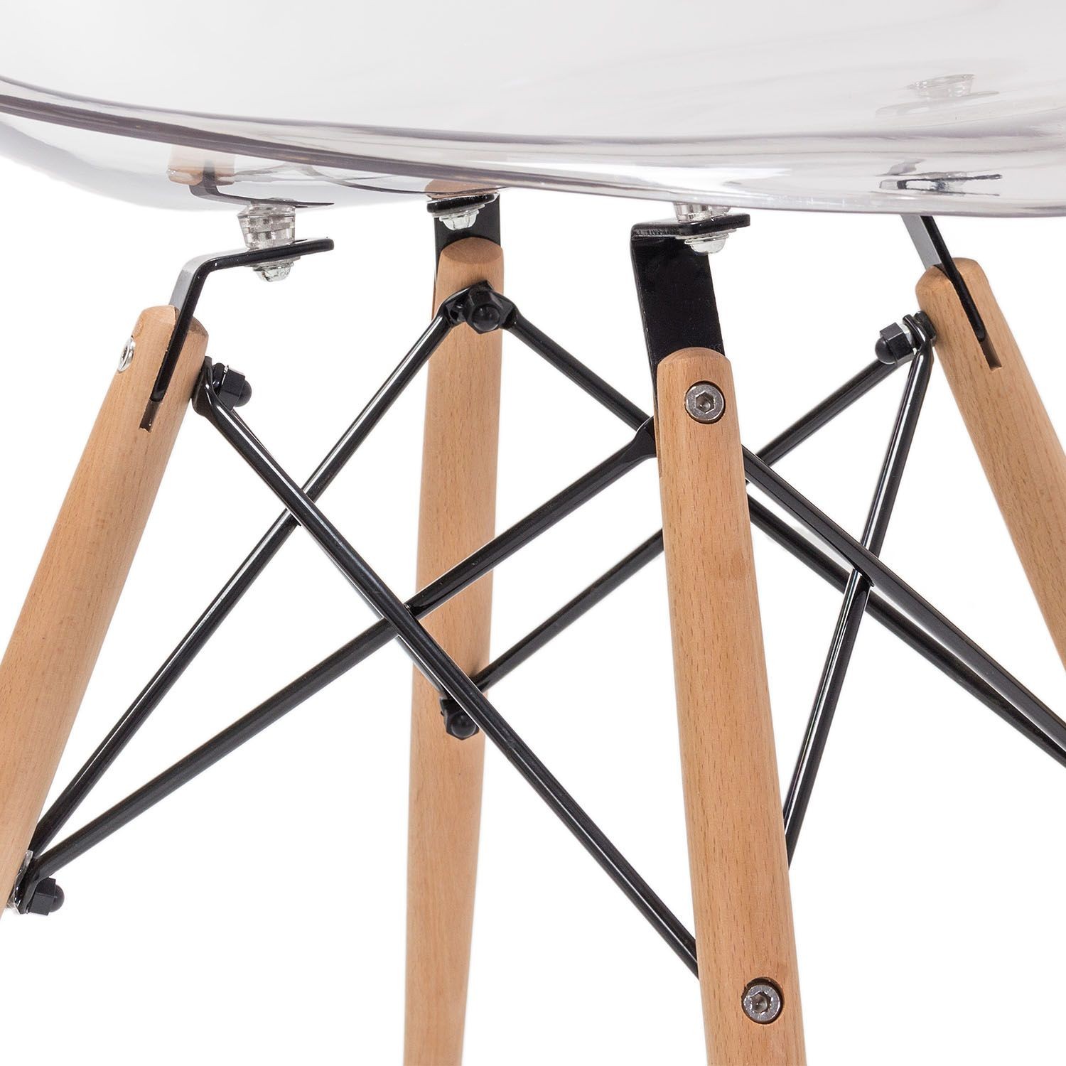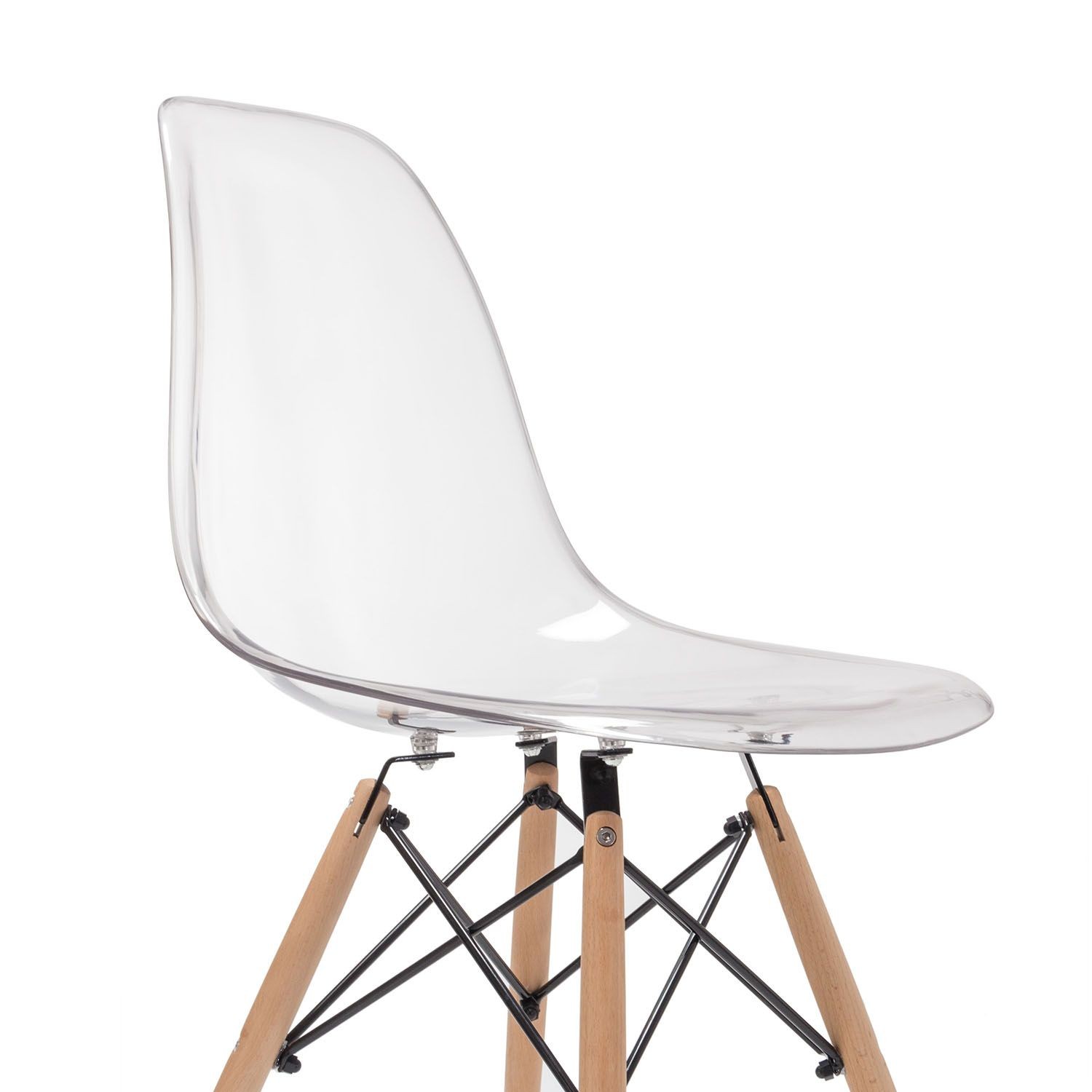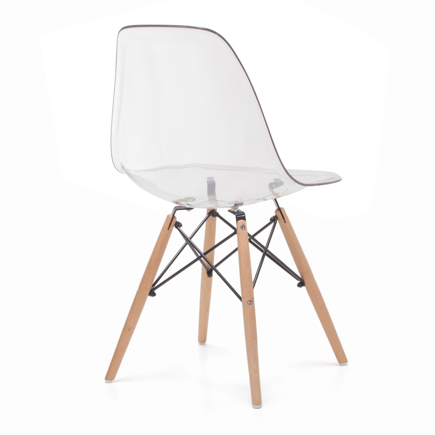 Nos inspiramos en este diseño fabricando una resistente y exclusiva silla con un asiento y respaldo de polietileno tereftalato transparente de altas prestaciones en una sola pieza cuidada al detalle. Dispone de sus ya irreconocibles varillas en acero lacado negro a modo de cruceta que sujetan las cuatro patas de madera natural de haya tratada que dan el toque genuino a este modelo.