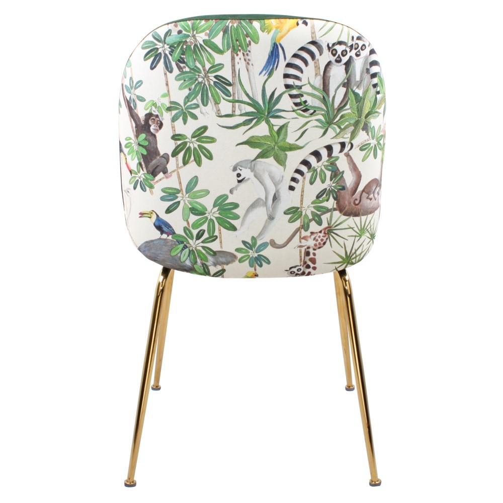 Consta de un asiento y respaldo de pieza única, realizado en un agradable y suave terciopelo de color verde con un bonito estampado de animales y plantas propios de la selva; un asiento mullido y confortable. Además su estructura es firme y resistente en forma tubular metálica en color latón.