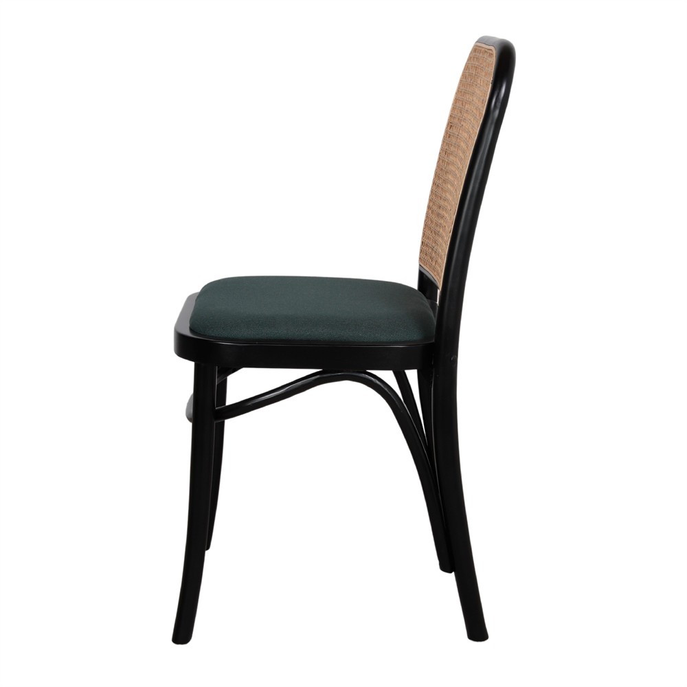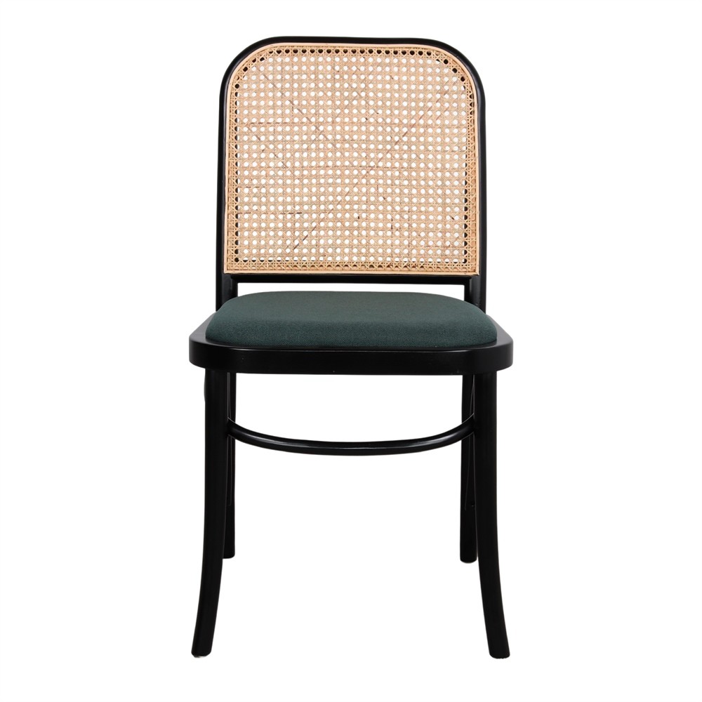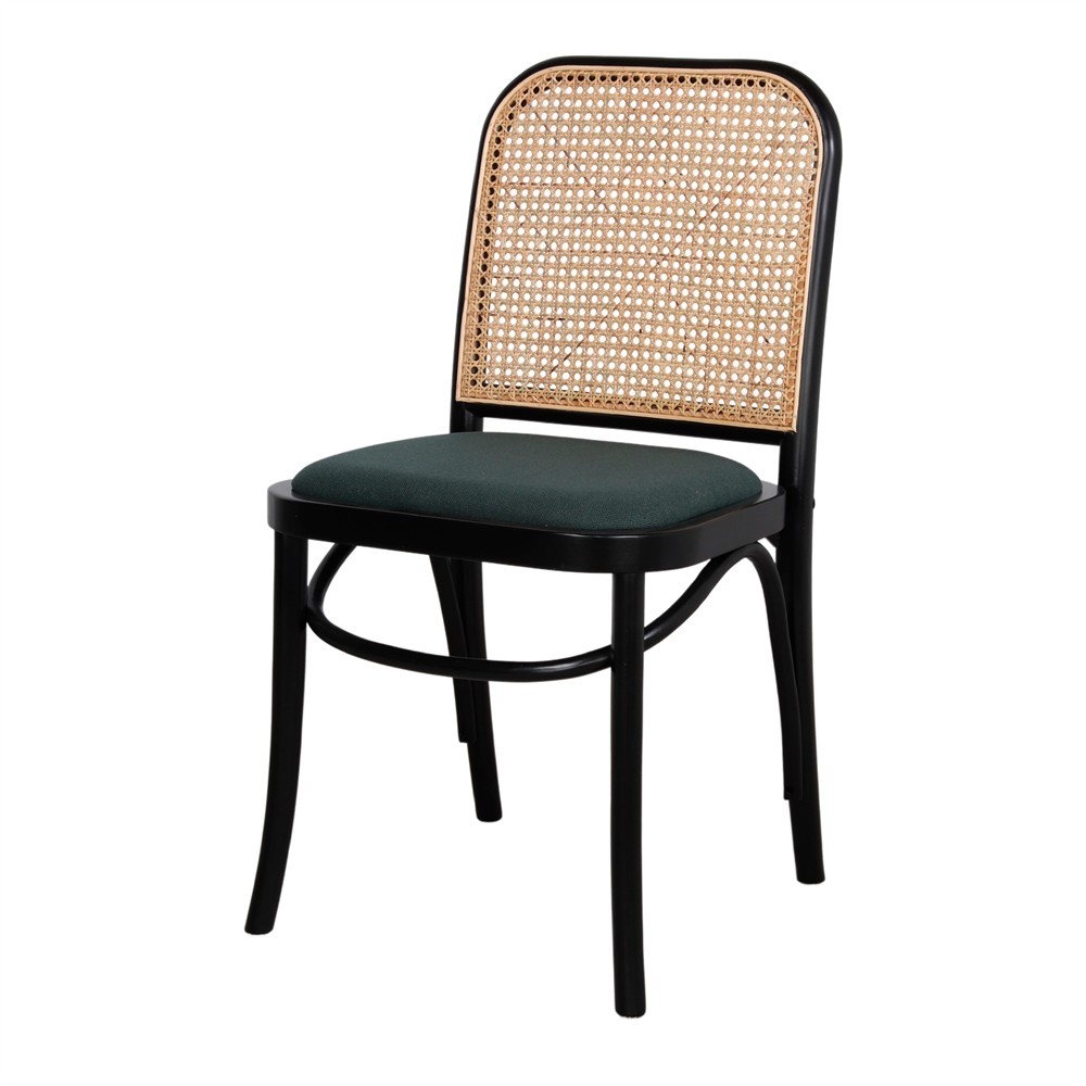 Está diseñada y fabricada con estructura de madera de haya natural lacado en color negro, su asiento consta de un tapizado en tejido de color verde y el respaldo está realizado en rejilla de enea.