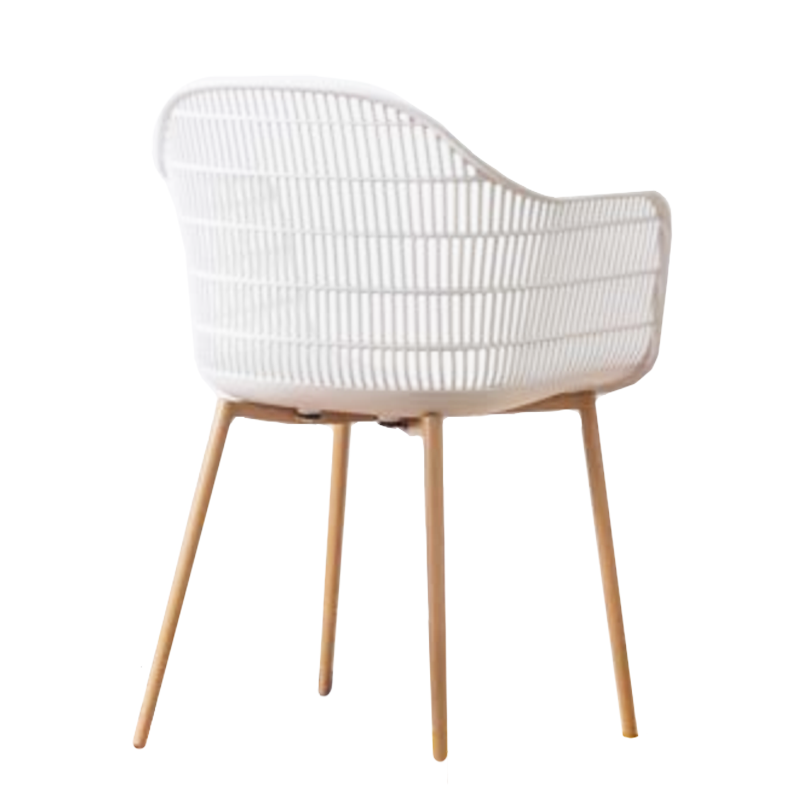 La silla de comedor VINKAL está constituida por un asiento de polipropileno y cuatro patas metálicas con acabado que imita a la madera. Estos materiales aportan cierta suavidad visual, debido a sus finas patas y su asiento que deja pasar los rayos de luz, por no hablar de sus colores que nos recuerdan a la pureza y la naturaleza