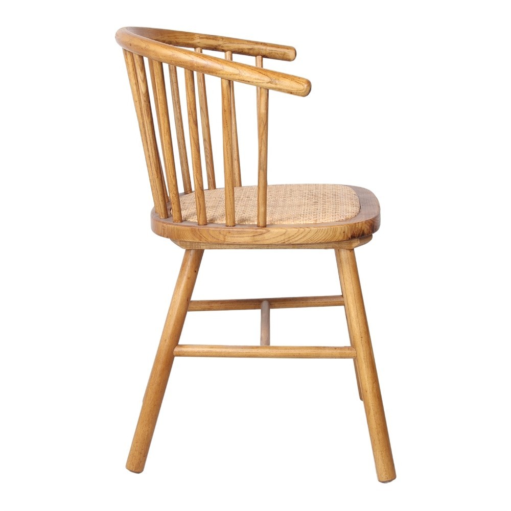 Ha sido fabricada cuidadosamente en madera de olmo, con su asiento en rattan natural. Especialmente queremos destacar el respaldo, ya que ha sido diseñado mediante varillas colocadas en posición vertical que culminan creando una silla con reposabrazos. Además el respaldo es ligeramente curvo, lo que permite que la espalda quede perfectamente encajada y la sensación de comodidad sea mucho mayor.