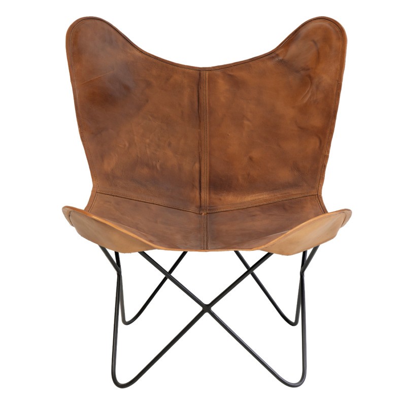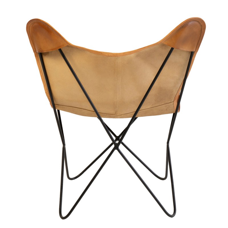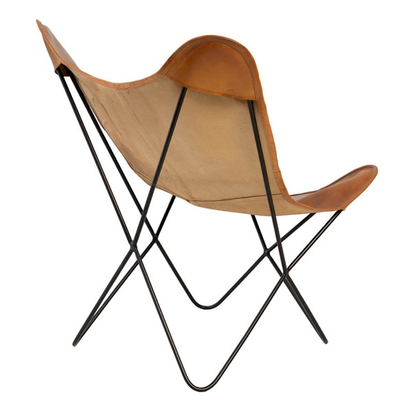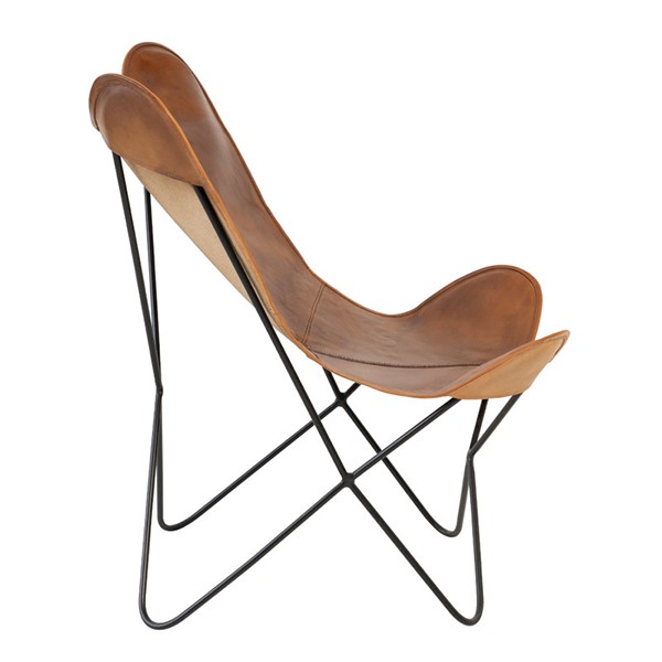 Un modelo en forma de mariposa formado por un asiento realizado en cuero en tonalidad tostado con un bonito trenzado en los bordes redondeados, y estructura de acero en color negro con una forma original y poco común.