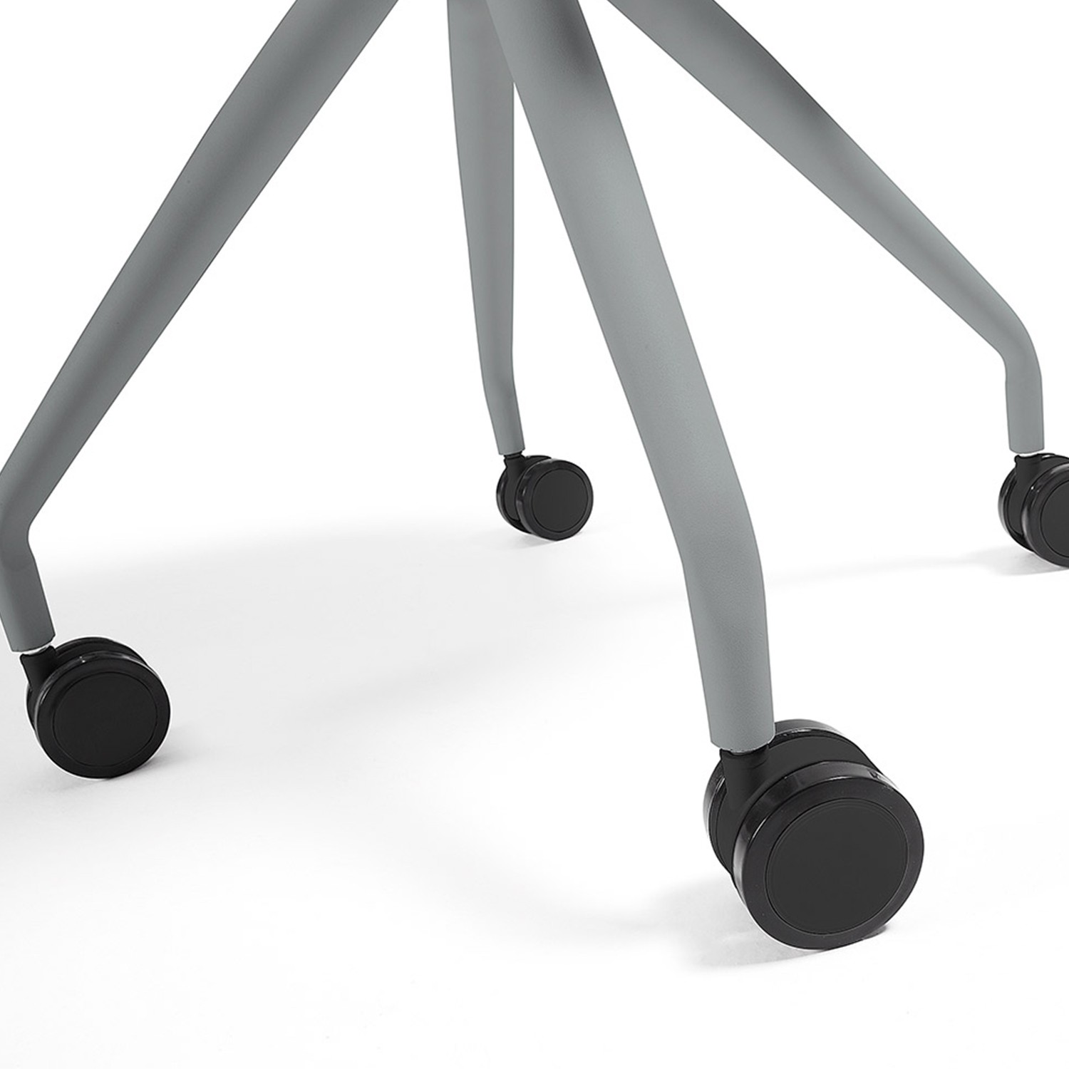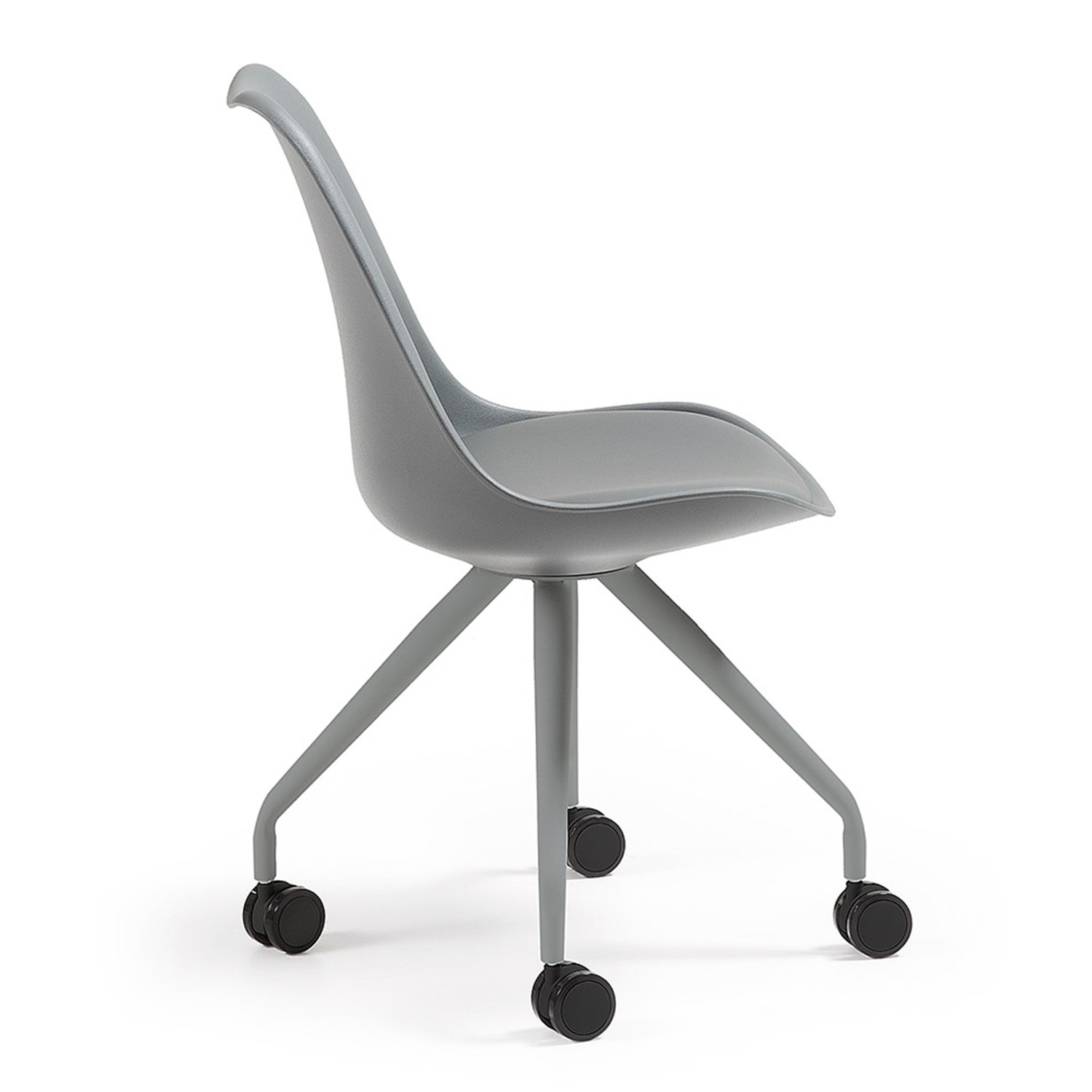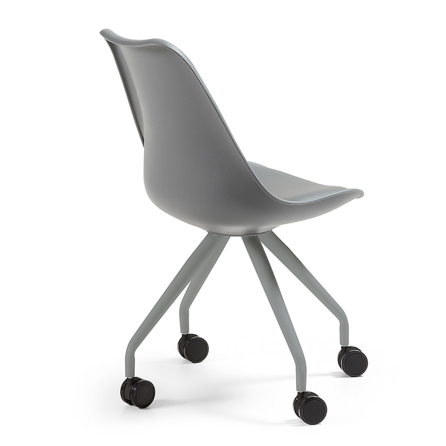 Una silla con ruedas giratorias blandas, un conjunto de sillería de tendencia nórdica con claros toques de modernidad y estilo rompedor. El asiento y su respaldo están fabricados en plástico polipropileno de color gris y dispone de un cojín en polipiel del mismo color con interior en mullida espuma. Por último, una maravillosa estructura en forma de cuatro patas en acero cromado.