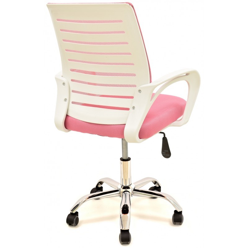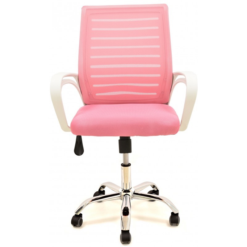 Un modelo que tiene otra serie de características: giratoria, regulable en altura para ajustar adecuadamente a tu mesa de trabajo, base cromada con 5 ruedas para una gran movilidad. Además su armazón está realizado en polipropileno, material resistente y de calidad, con respaldo en malla y asiento tapizado en tejido de color rosa. Además de adquirir reposabrazos que refuerzan su estructura y respaldo que se adapta a la zona lumbar.