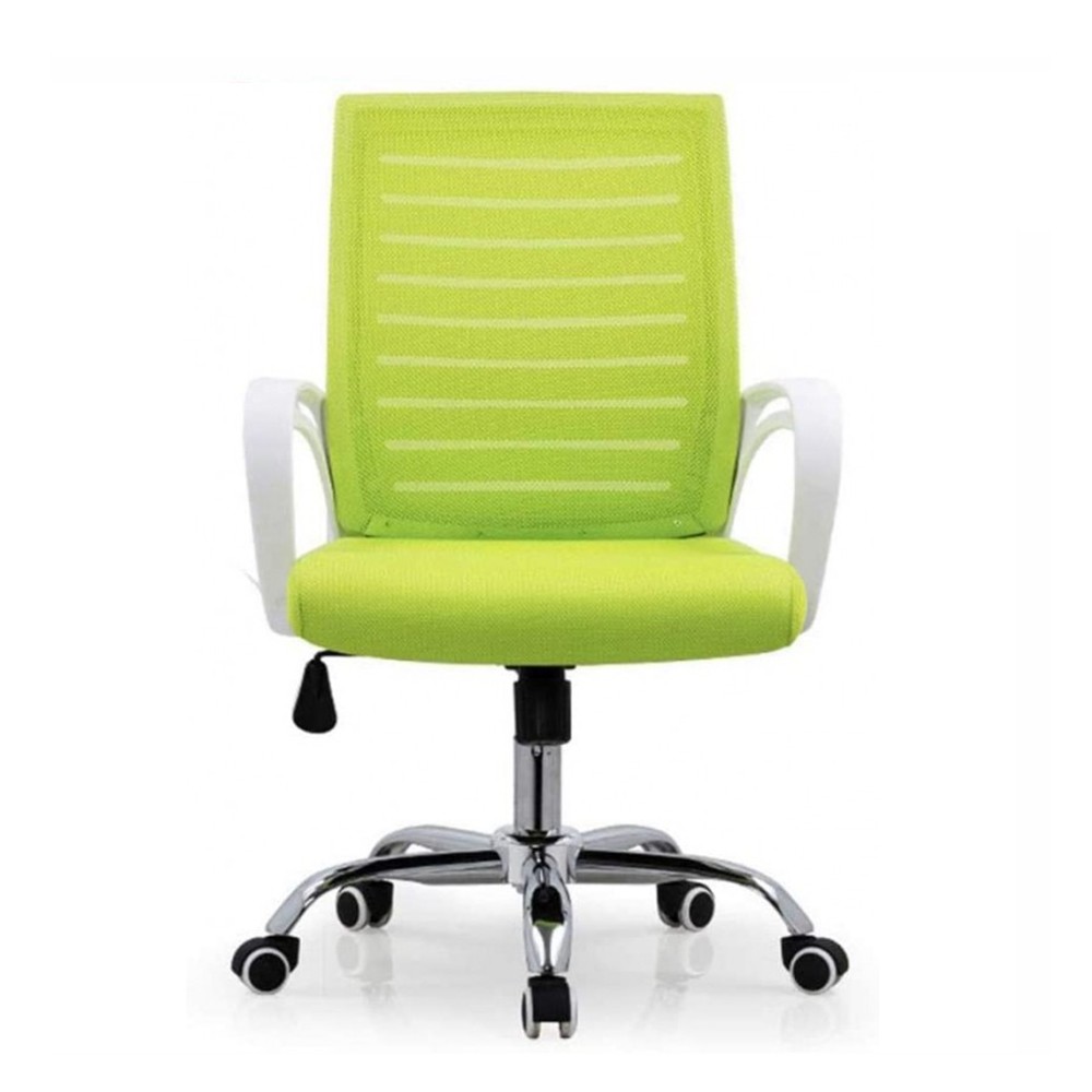 Su estructura está fabricada en polipropileno de color blanco, respaldo en malla y asiento tapizado en tejido de un color verde intenso. De estilo casual y juvenil que se adapta a diversos ambientes de trabajo.
