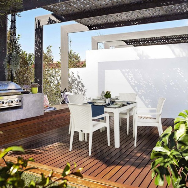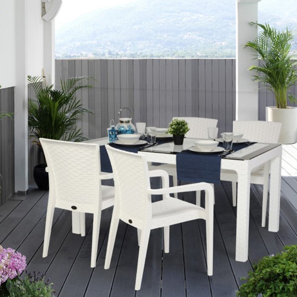 Es una silla apilable además que ligera, con lo cual siempre es más fácil de trasportar. Fabricada en polipropileno, un material muy resistente con un acabado que imita al rattan, diseño muy fácil de acoplar a cualquier estilo. Una silla que también podrás integrar a tu decoración de interiores e incluso en negocios de hostelería.