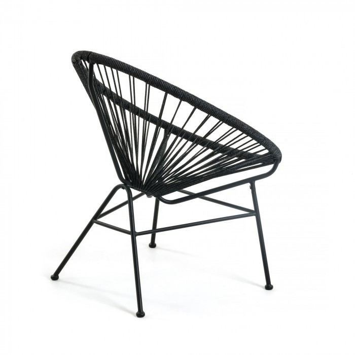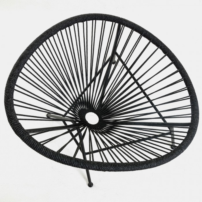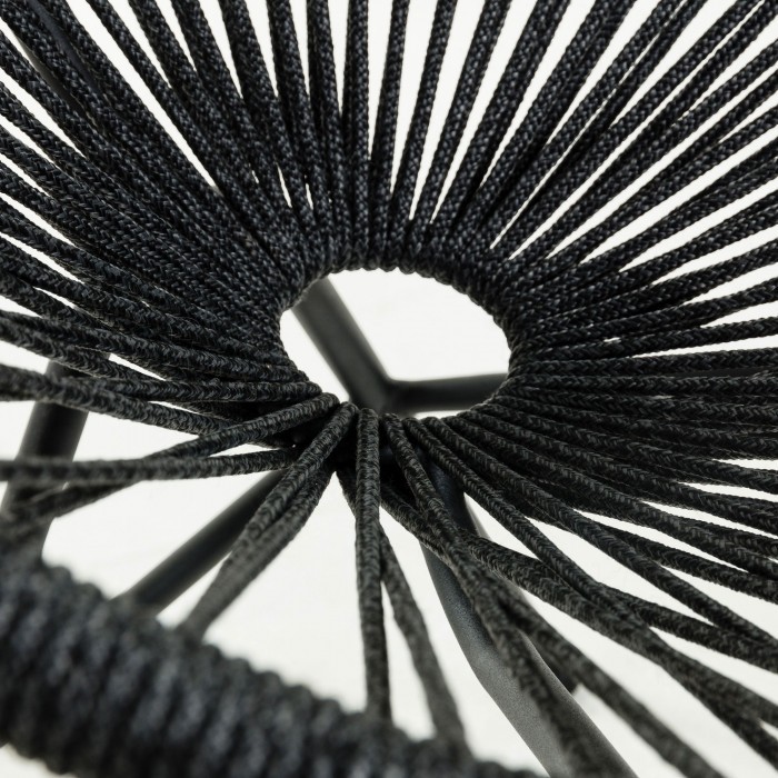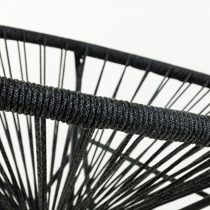 Consta de un asiento ovalado, con un diseño que favorece la comodidad del usuario y que se ha realizado mediante el trenzado manual de cuerdas flexibles en acabado de color negro, y tratadas previamente para una mayor tolerancia a los rayos ultra violeta.