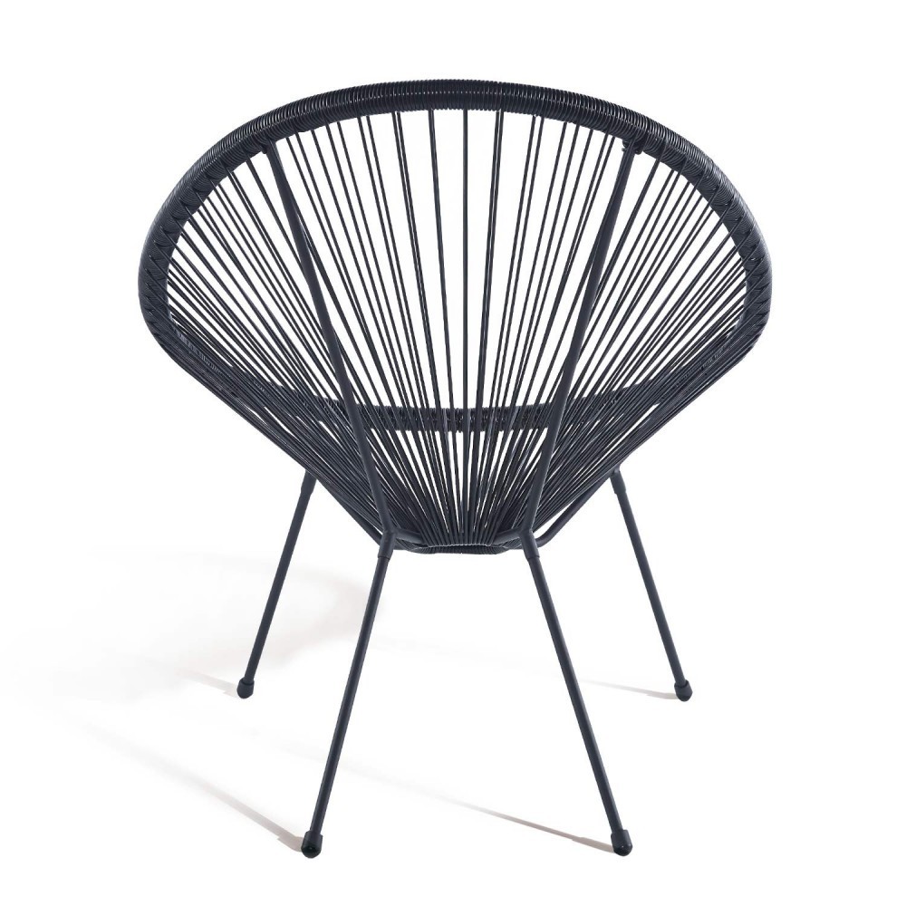 Por eso su asiento está fabricado en un tejido de cordones de PE, polietileno, flexibles muy resistentes para que puedas pasar largas horas de descanso en esta estilosa silla. Dicho material no retiene el calor del sol, gracias a la emulación de las antiguas técnicas de tejidos mayas. La estructura que soporta el asiento está fabricada en acero negro con lacado.