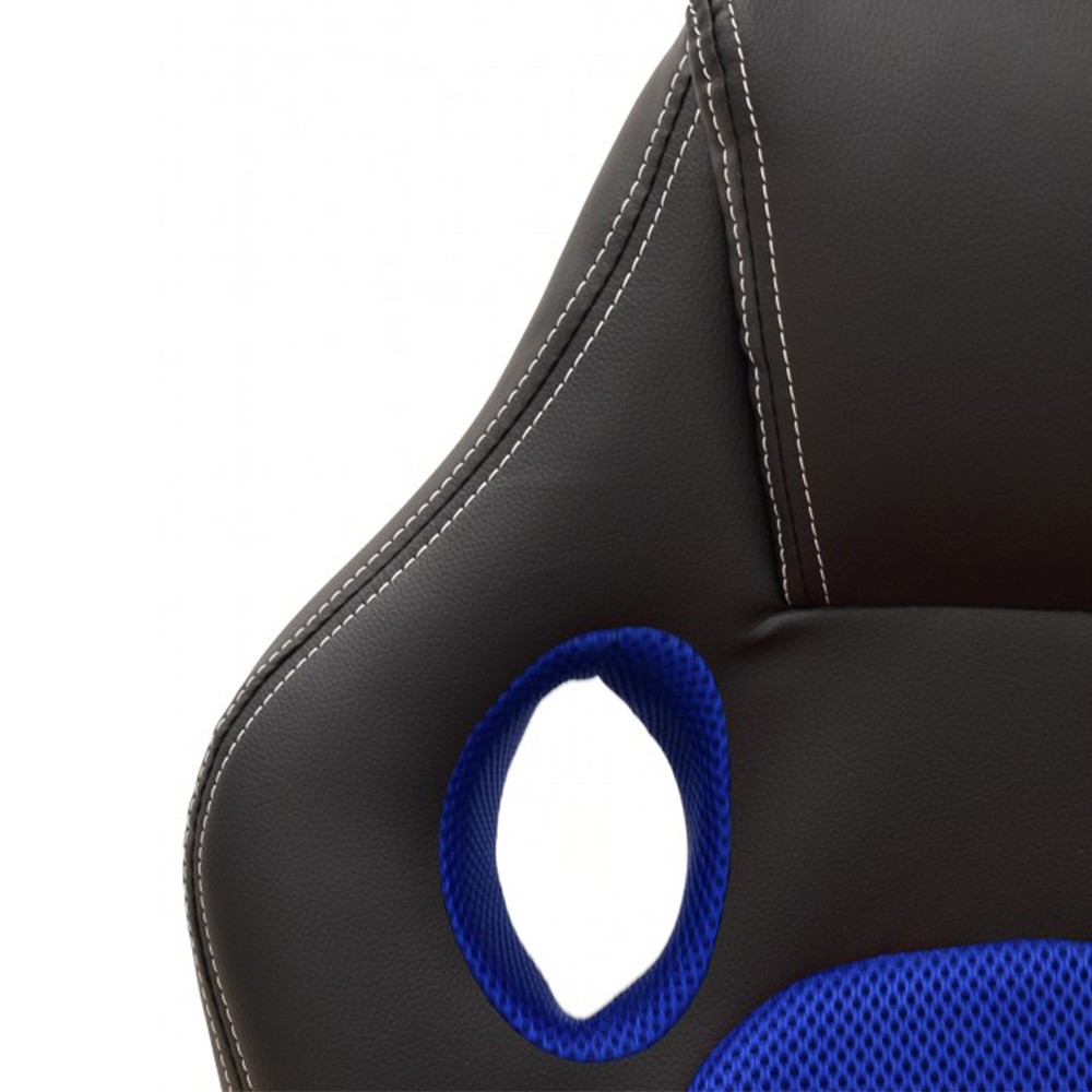 Realizado su asiento en similpiel de color negro con pespuntes en hilo blanco y tejido en un llamativo color azul; además es basculante, giratorio y regulable en altura para que la adaptes a tus necesidades y un punto extra al llevar reposabrazos tapizados y mullidos. Su estructura resistente es de metal en acabado cromado.