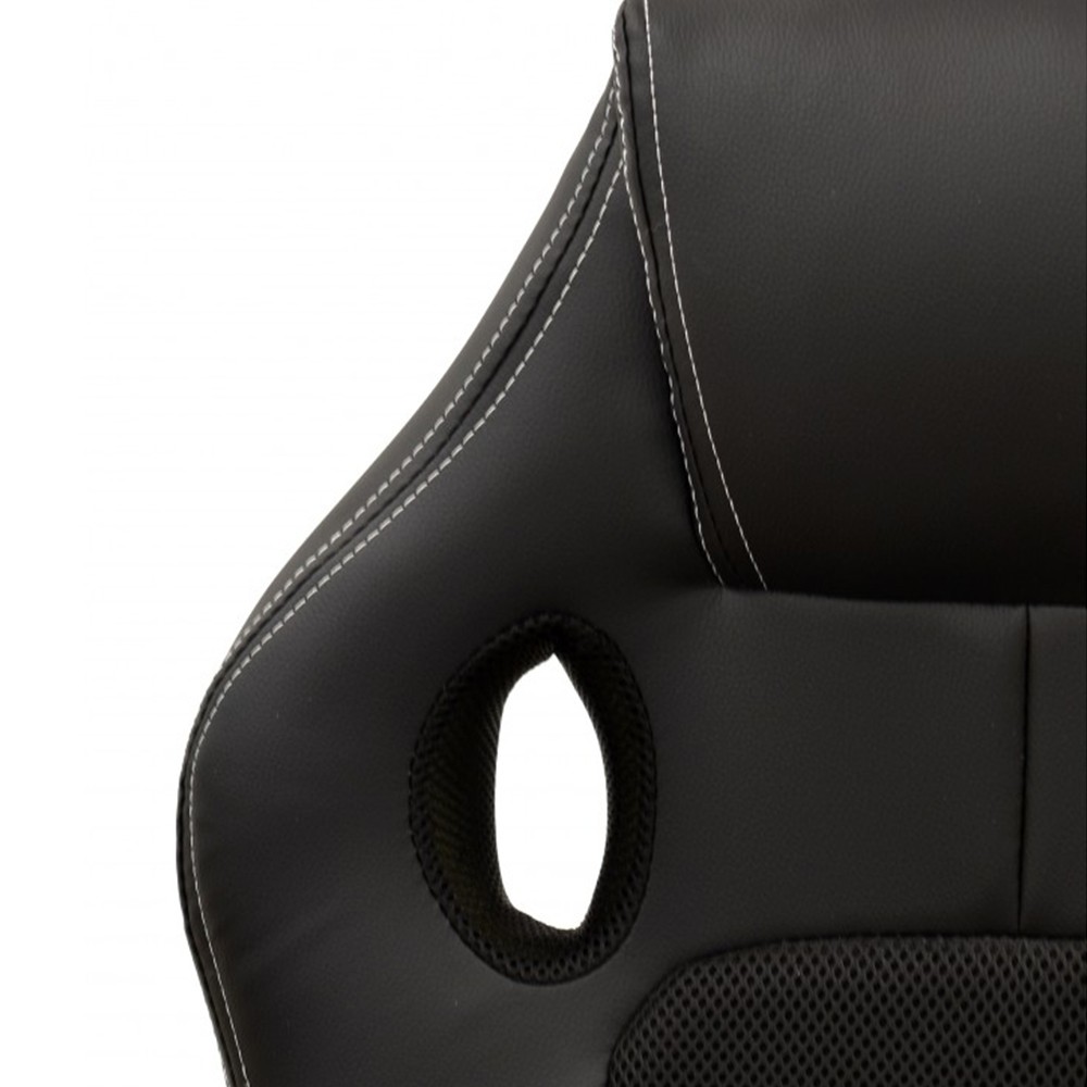 Su mullido y confortable asiento está tapizado en similpiel, mejor calidad que la polipiel, y tejido mesh de color negro con unos bonitos pespuntes en blanco para romper su seriedad. Cuenta con reposabrazos y reposacabezas, asiento giratorio, basculante y regulable sobre una estructura de metal cromado.