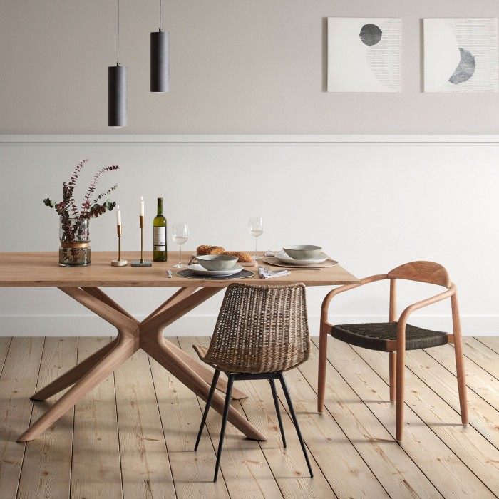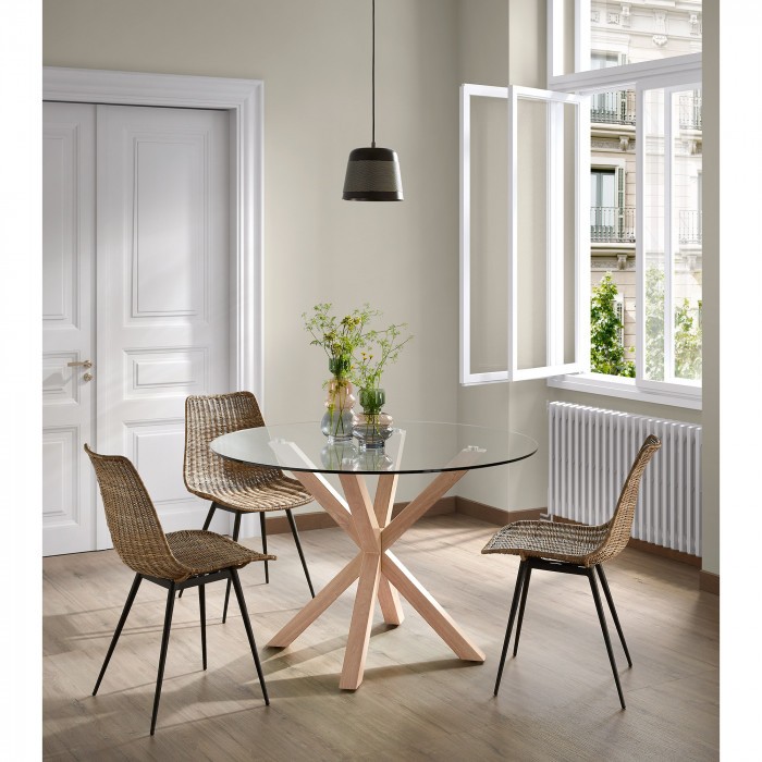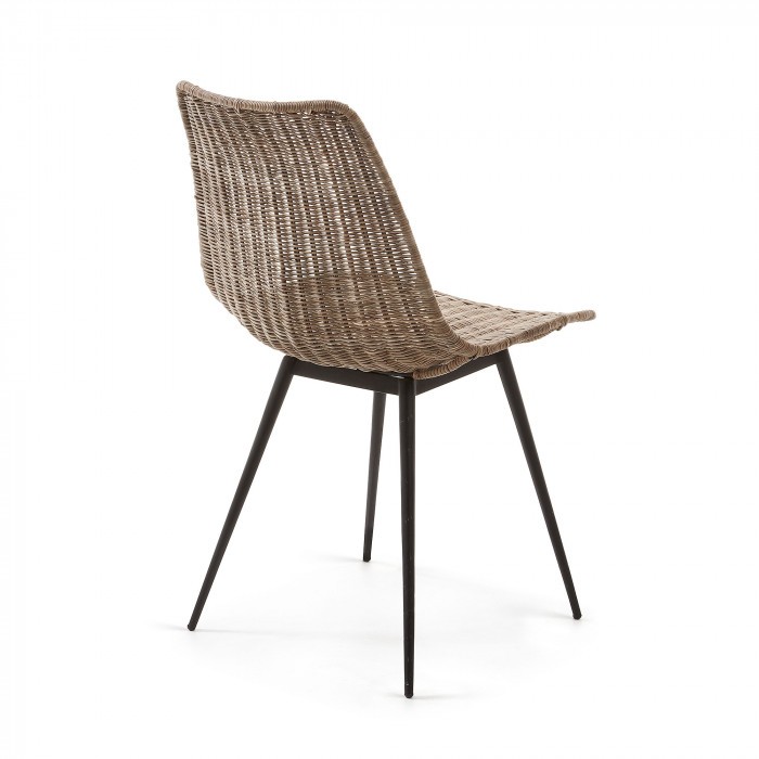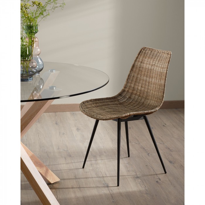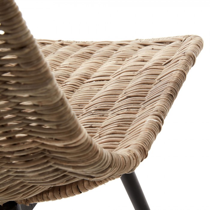 Hablamos de la silla de ratán ANNCRE. Una versión pensada para salones y comedores variados, constando de cuatro patas de metal pintado por pulverización en color negro. Estas patas se encargan de sostener un asiento y respaldo de pieza única fabricados, como hemos dicho anteriormente, en ratán trenzado natural.