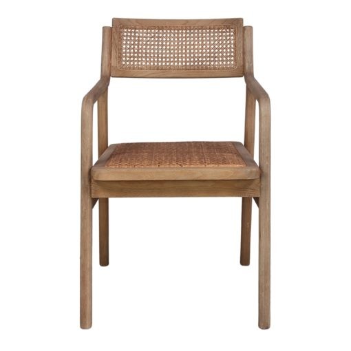 MEDITERRÁNEA es una silla con reposabrazos formada por una estructura realizada en madera de olmo, excepto el asiento y el respaldo, que han sido trabajados mediante rejilla de ratán natural.
