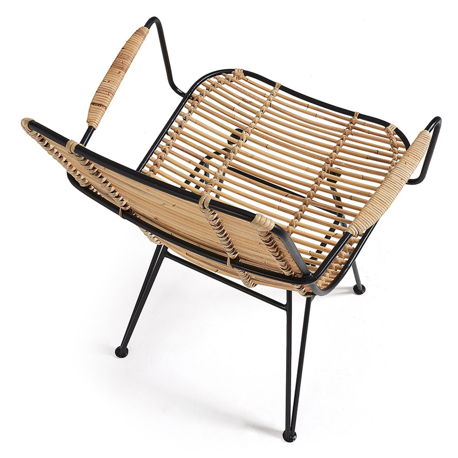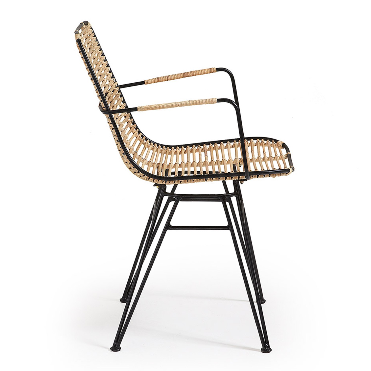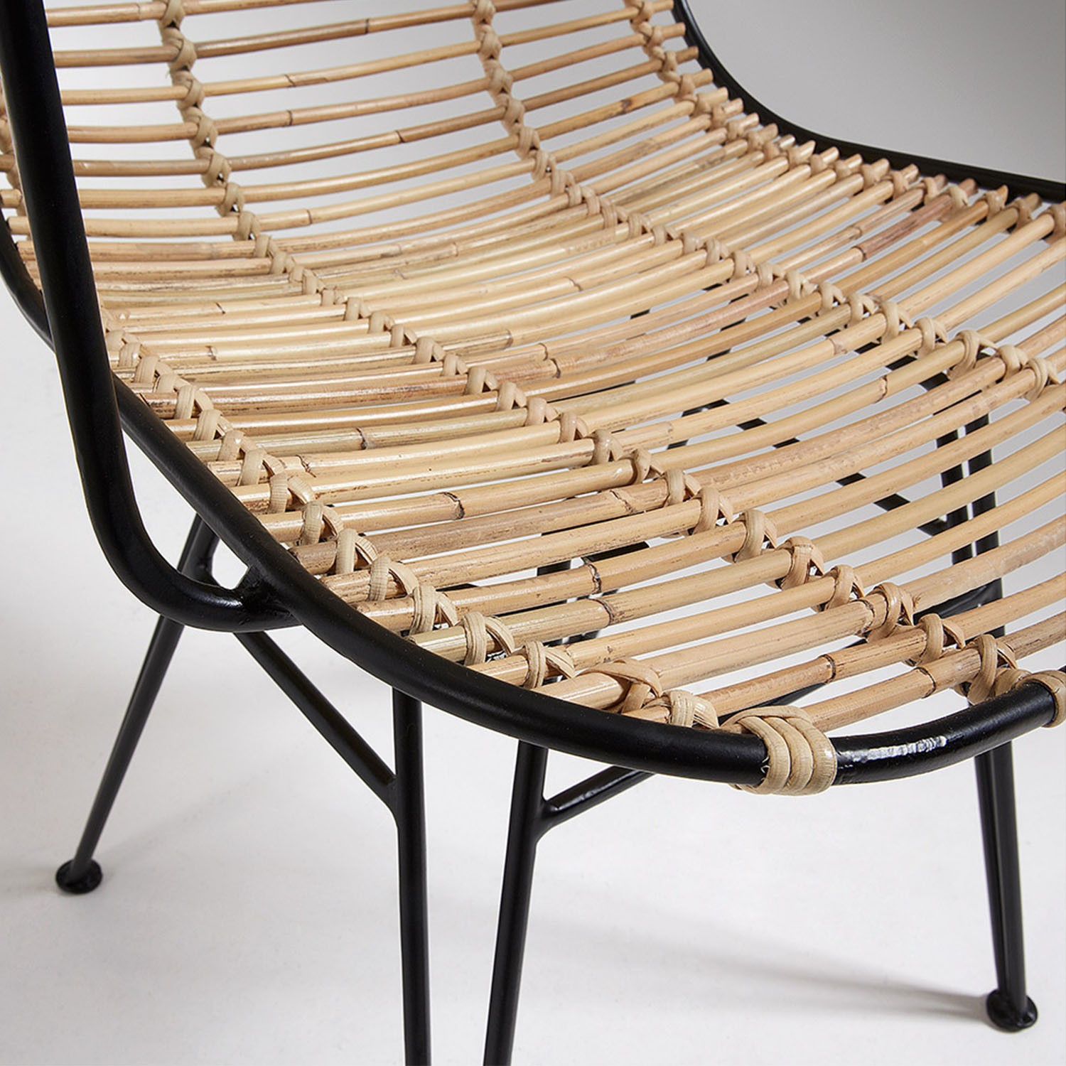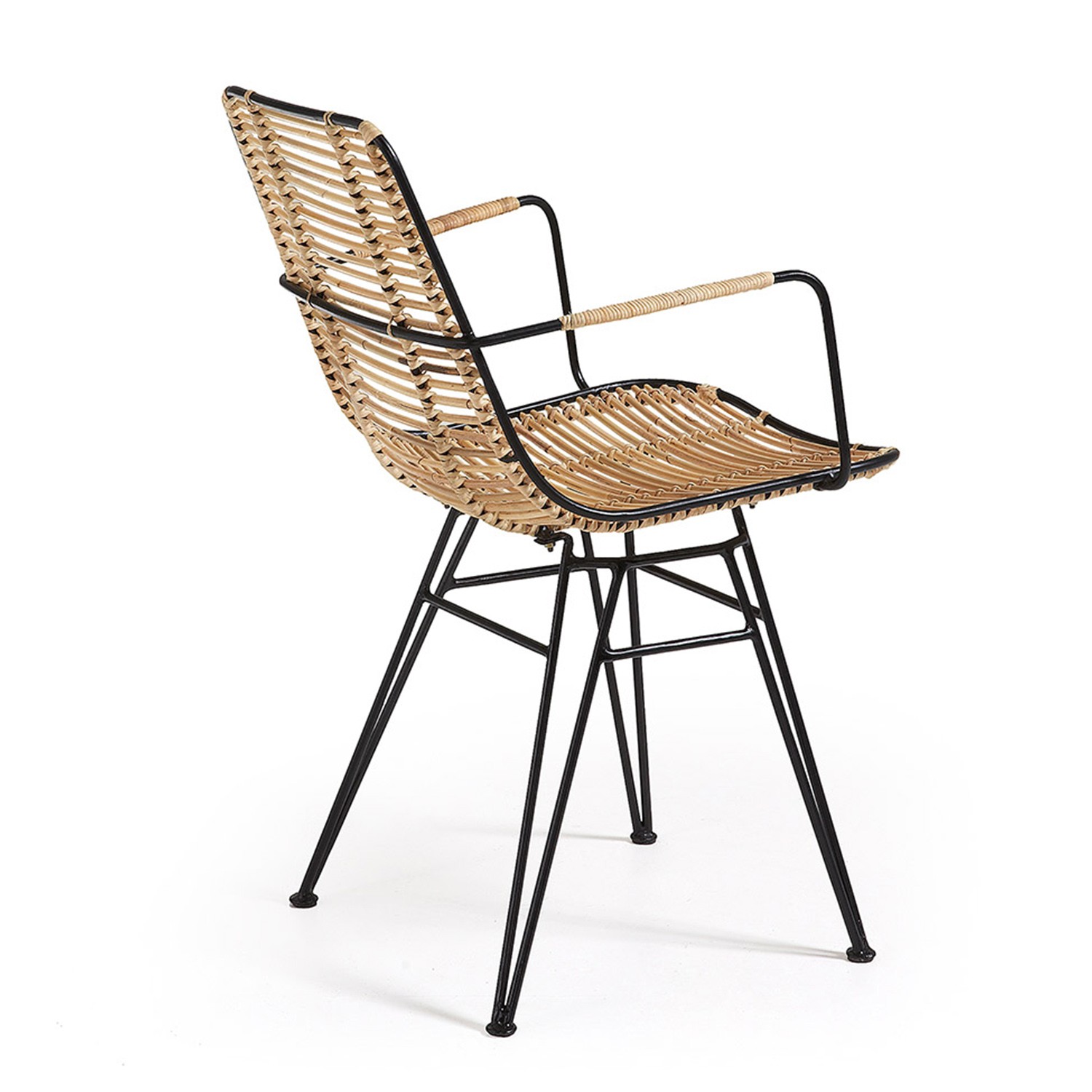 Describimos la silla en dos partes. Por un lado, el asiento y respaldo, realizados en ratán, un material que te hará sentir muy cómodo. Por otro lado, su estructura, metálica y pintada en color negro. Recordar, que en nuestra web está disponible el mismo modelo con la estructura pintada en color blanco, si crees que así lucirá mejor en tus espacios.