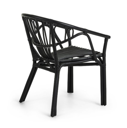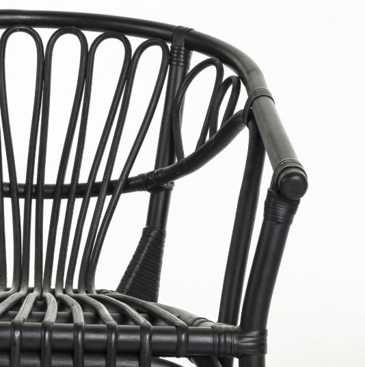 Se trata de un modelo realizado en su totalidad en ratán. Esta vez, se ha elegido el color negro para su acabado final. De la silla, queremos fijarnos especialmente en la forma del respaldo. Y es que al ser curvo recoge a la perfección todo tu cuerpo y la sensación de comodidad es mucho mayor.