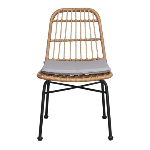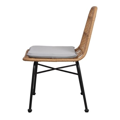 Te queremos presentar la silla de ratán SYRA, la cual posee un estilo étnico y tropical, fabricada con una estructura de varillas de acero con acabado en negro y respaldo y asiento de ratán sintético, también dispone de un cojín en color gris para mayor comodidad.