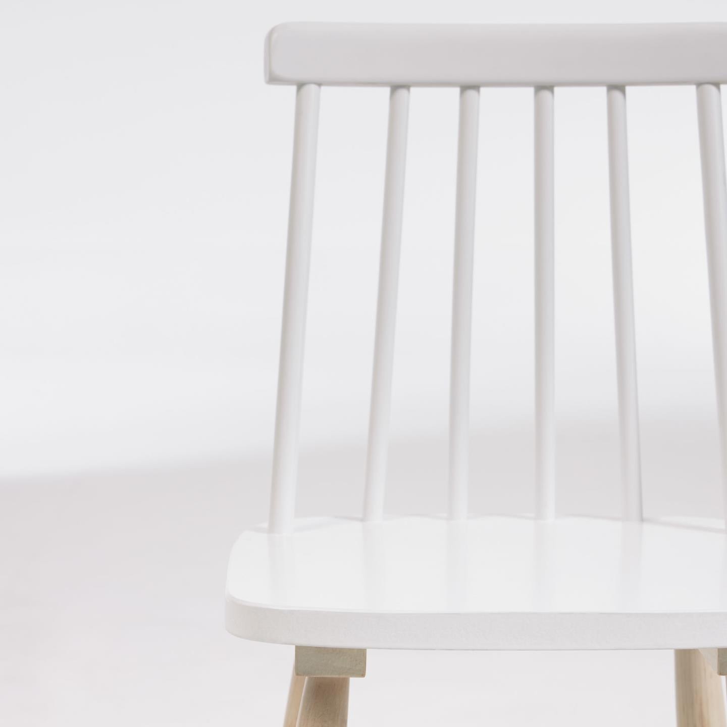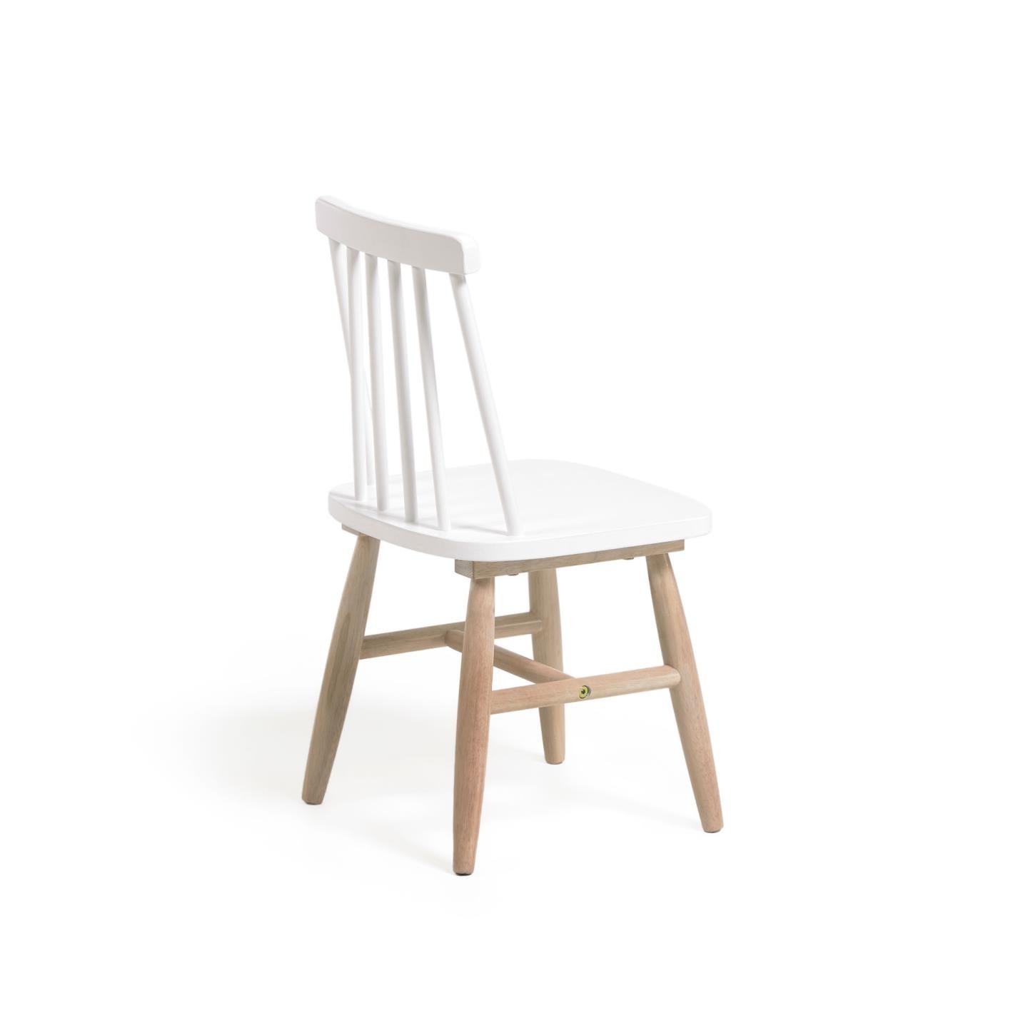 Confeccionada en su totalidad en madera maciza de caucho, combinando el blanco para su asiento y respaldo, y el tono natural de la madera para sus patas, las cuales se refuerzan en su parte central para mejorar la estabilidad.